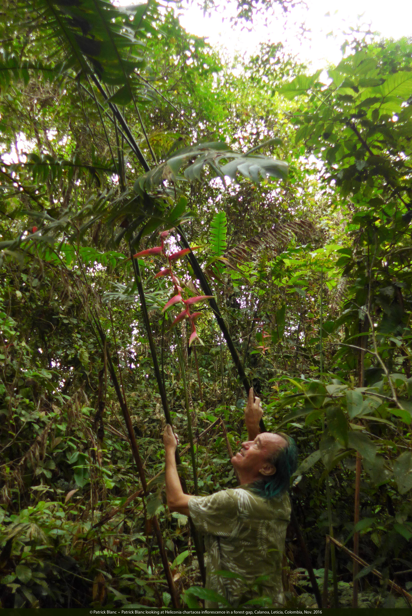 Patrick Blanc observing Heliconia hirsuta with zingiberoid leafy stems and bright red bracts, Calanoa, Leticia, Colombia, Nov. 2016