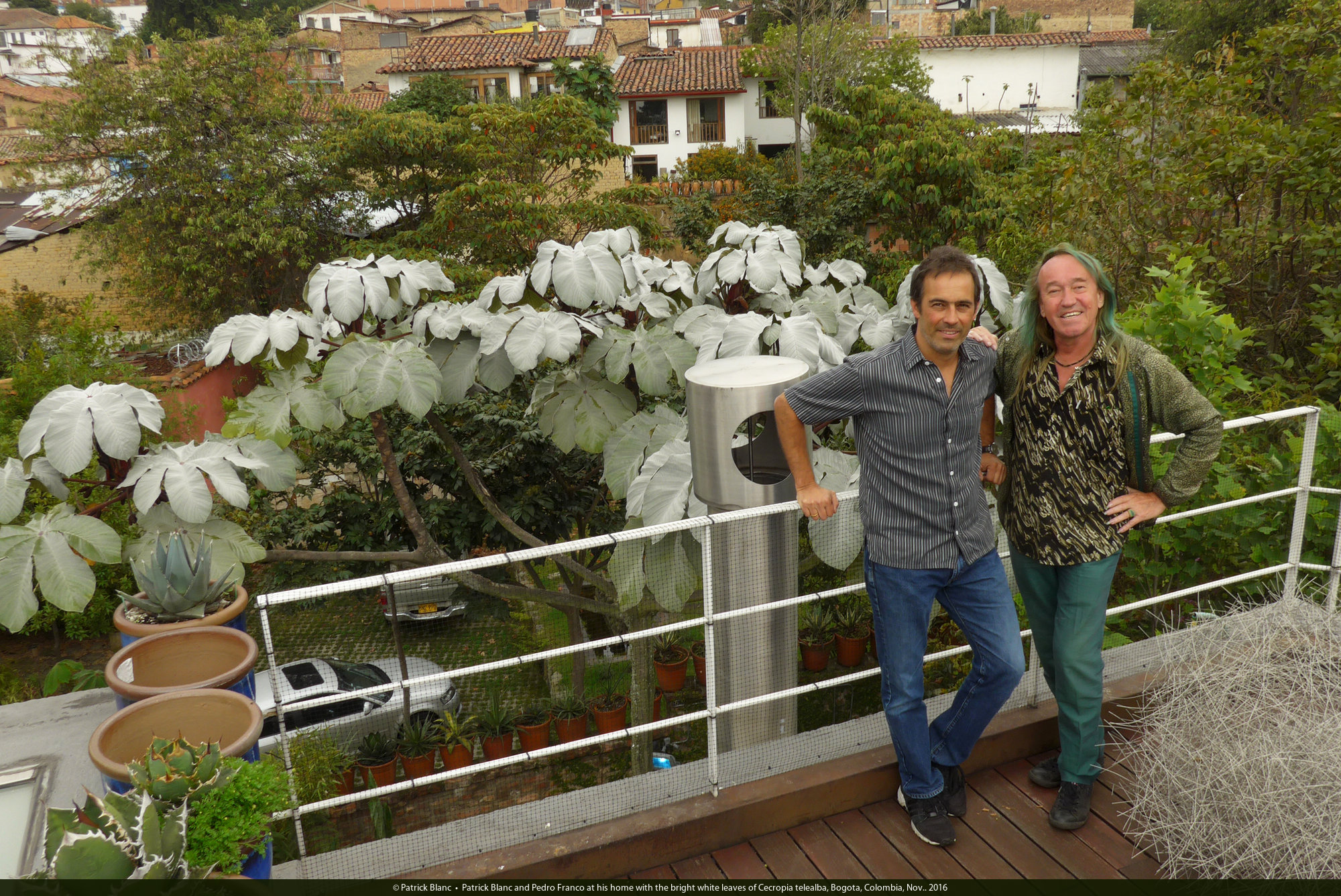Patrick Blanc and Pedro Franco at his home with the bright white leaves of Cecropia telealba, Bogota, Colombia, Nov.. 2016