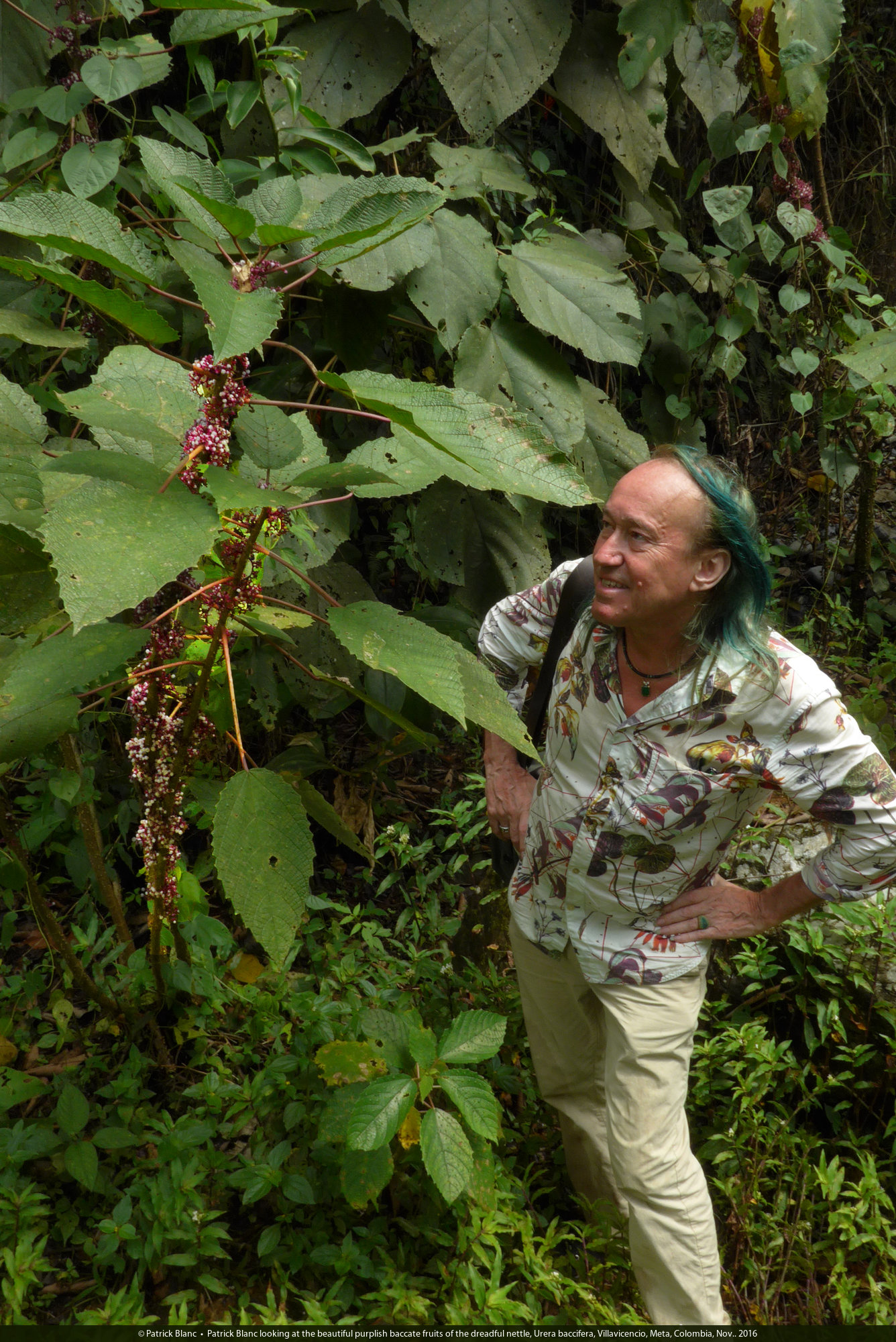 Patrick Blanc looking at the beautiful purplish baccate fruits of the dreadful nettle, Urera baccifera, Villavicencio, Meta, Colombia, Nov.. 2016