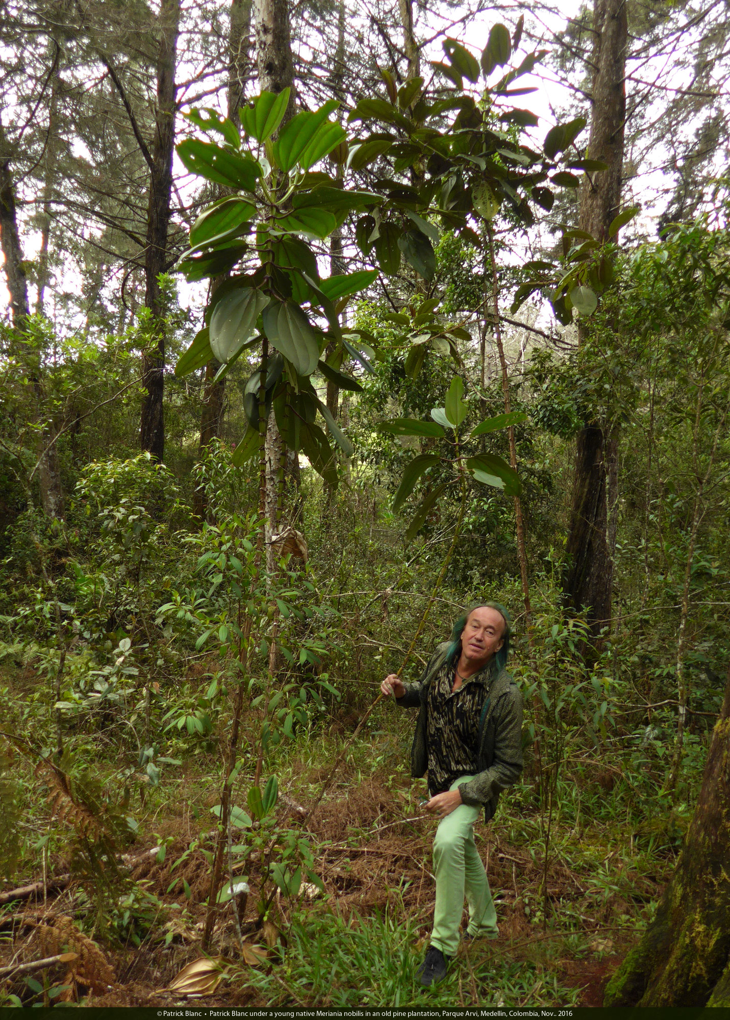 Patrick Blanc under a young native Meriania nobilis in an old pine plantation, Parque Arvi, Medellin, Colombia, Nov.. 2016