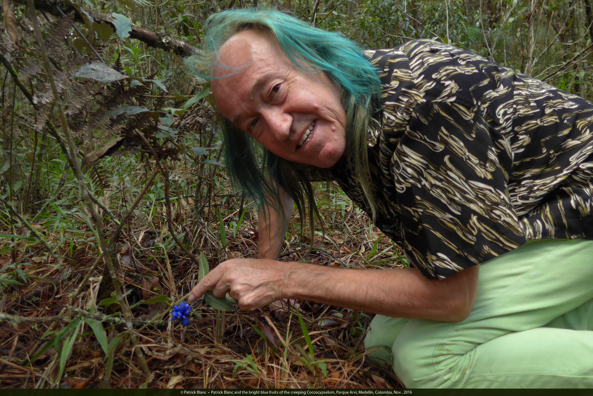 Patrick Blanc and the bright blue fruits of the creeping Coccocypselum, Parque Arvi, Medellin, Colombia, Nov.. 2016