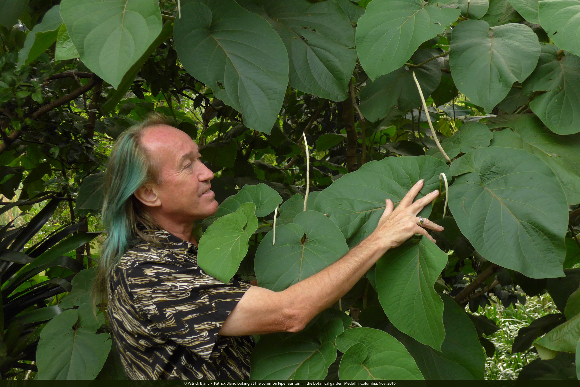 Patrick Blanc looking at the common Piper auritum in the botanical garden, Medellin, Colombia, Nov. 2016
