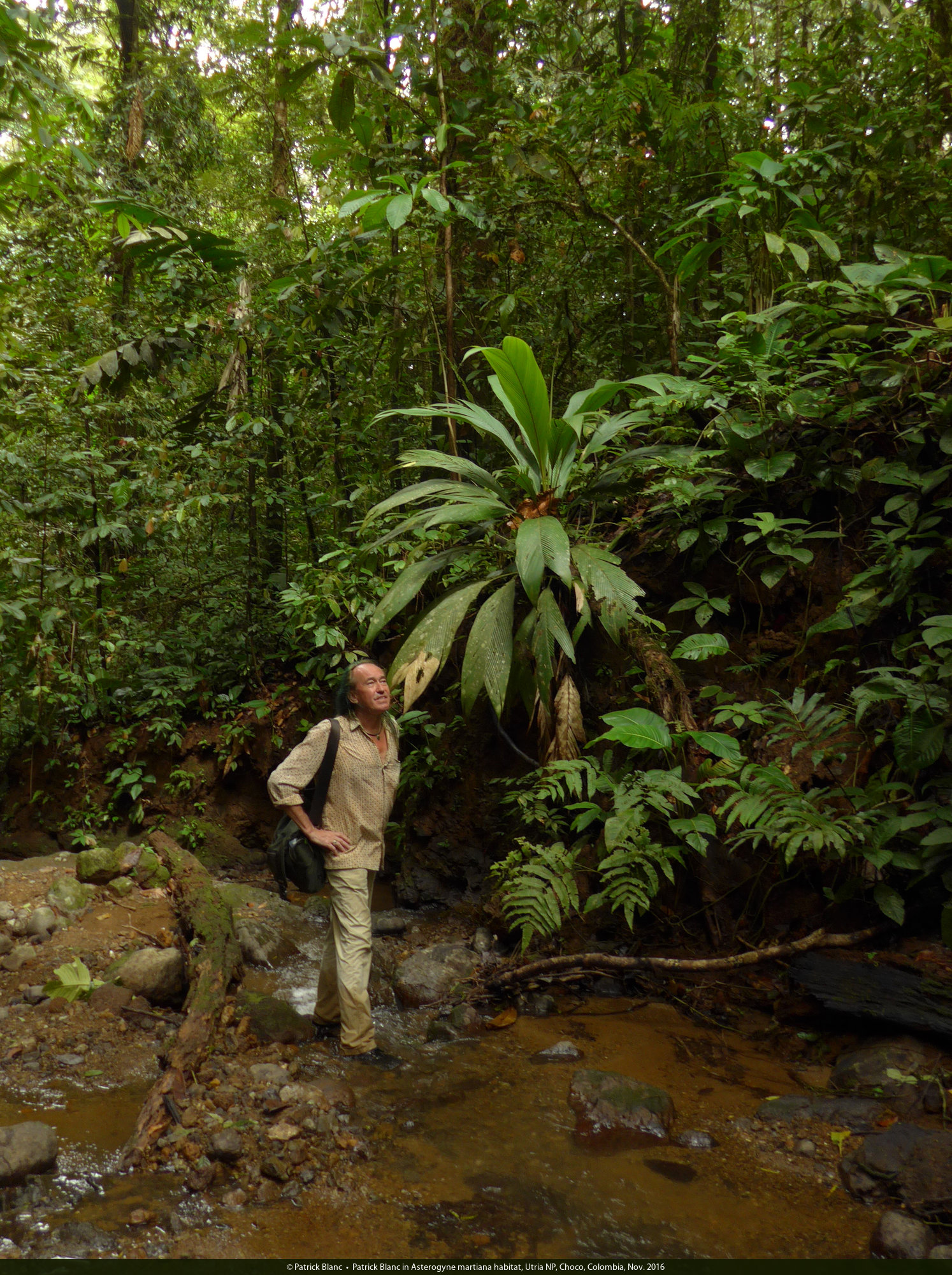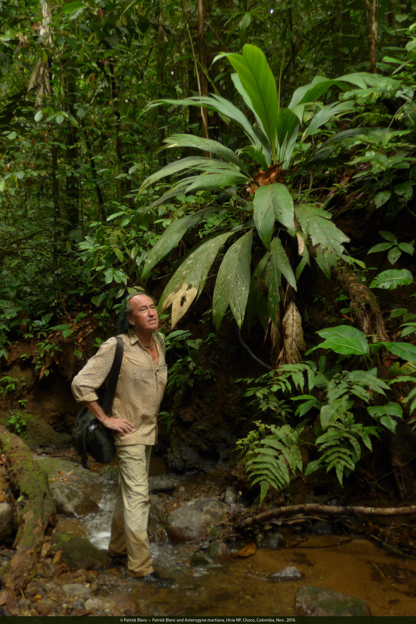 Patrick Blanc and Asterogyne martiana, Utria NP, Choco, Colombia, Nov.. 2016