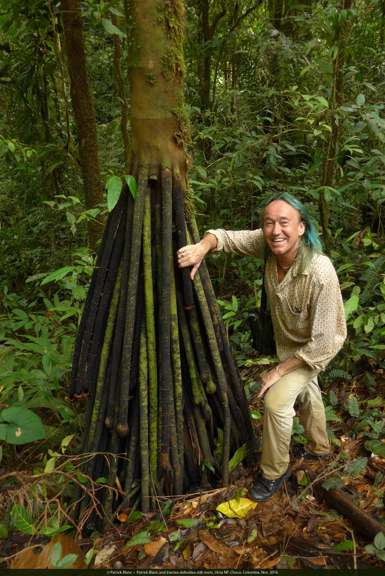 Patrick Blanc and Iriartea deltoidea stilt roots, Utria NP, Choco, Colombia, Nov. 2016