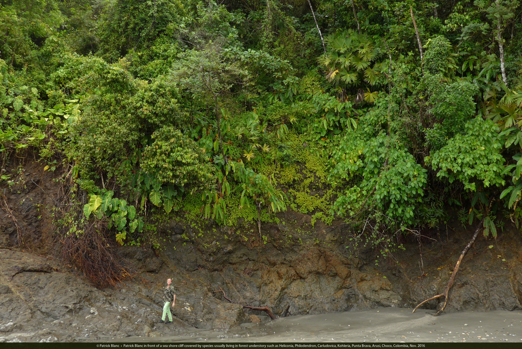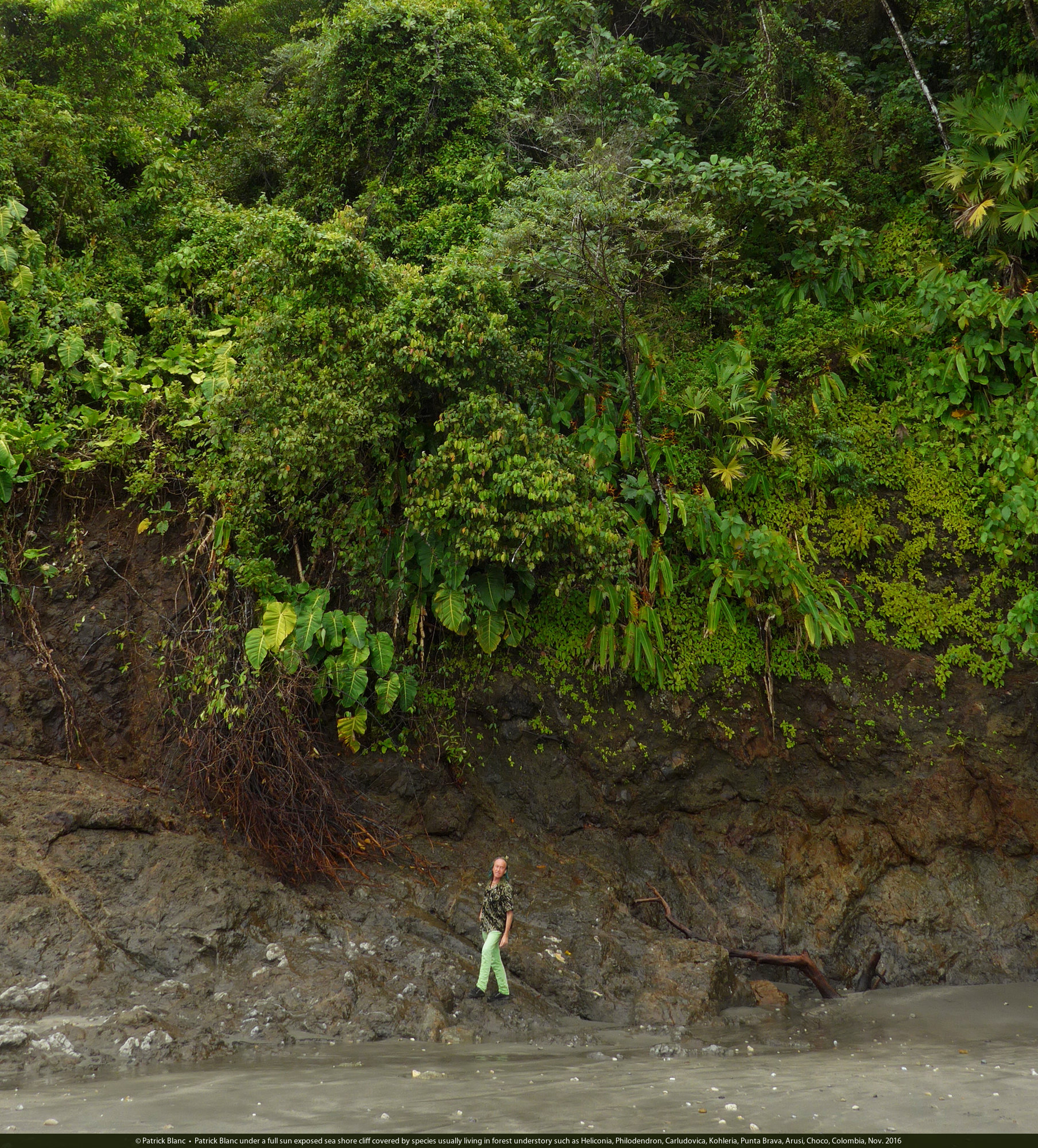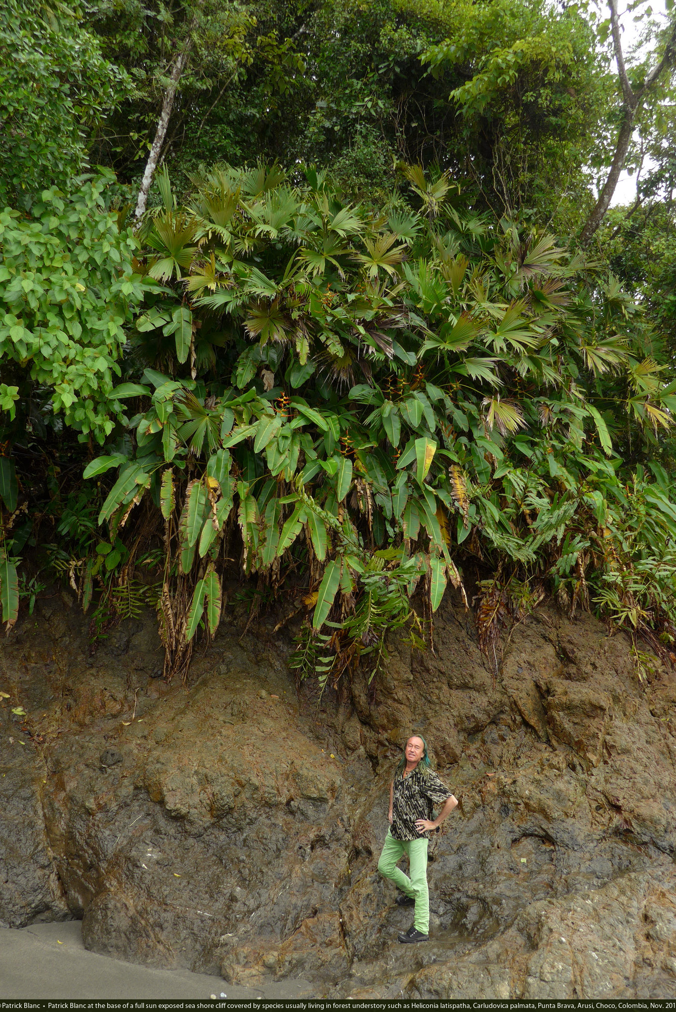 Patrick Blanc at the base of a full sun exposed sea shore cliff covered by species usually living in forest understory such as Heliconia latispatha, Carludovica palmata, Punta Brava, Arusi, Choco, Colombia, Nov. 2016