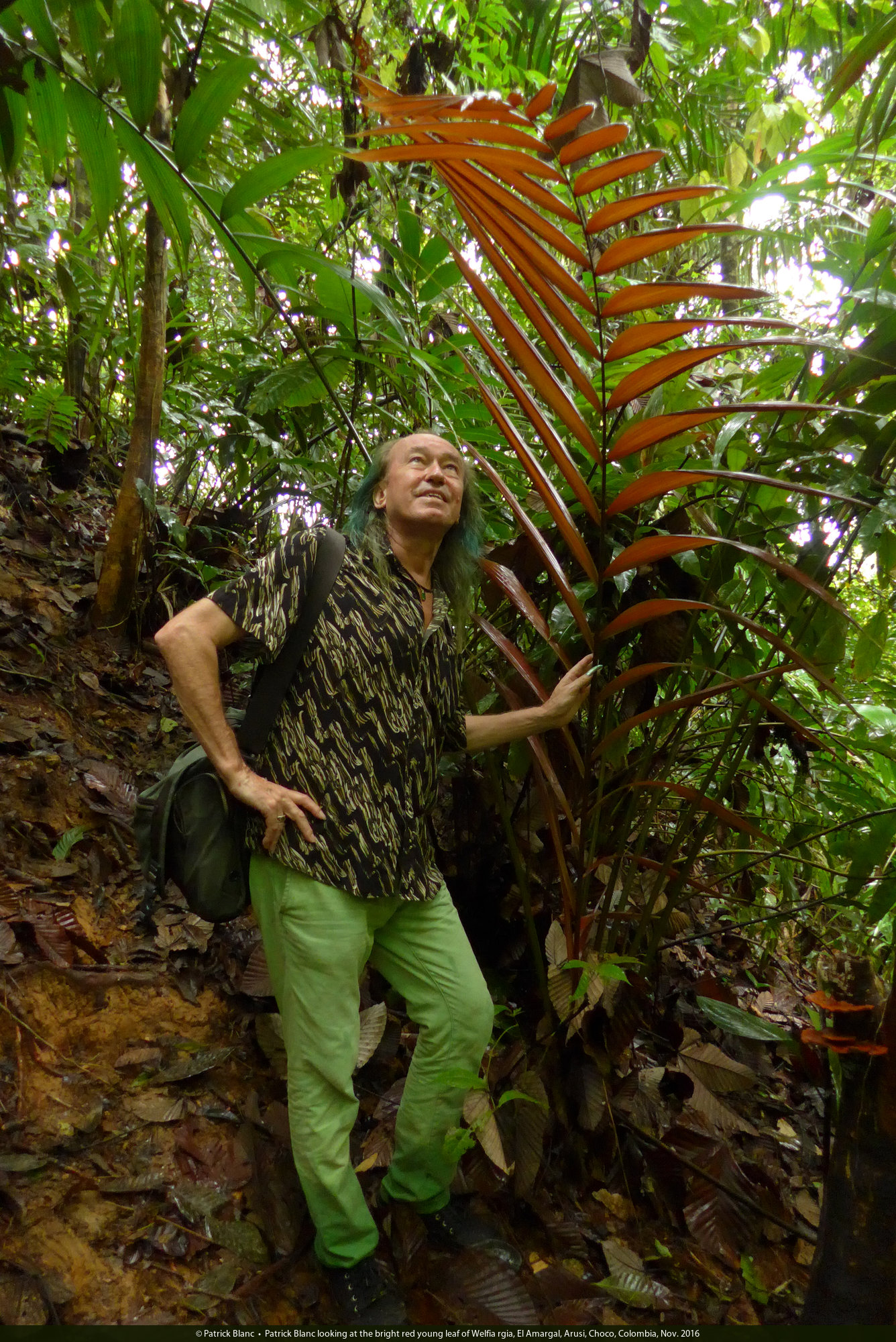 Patrick Blanc looking at the bright red young leaf of Welfia rgia, El Amargal, Arusi, Choco, Colombia, Nov. 2016