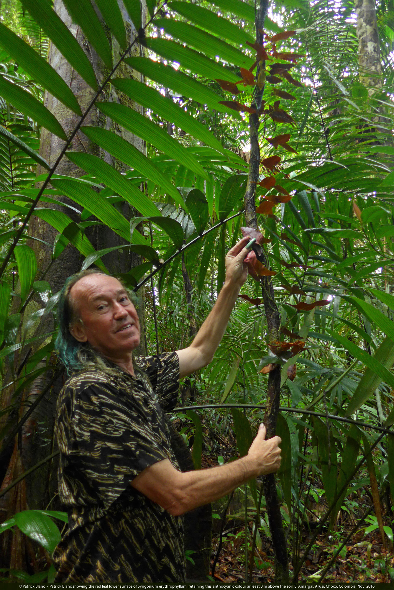 Patrick Blanc showing the red leaf lower surface of Syngonium erythrophyllum, retaining this anthocyanic colour ar least 3 m above the soil, El Amargal, Arusi, Choco, Colombia, Nov. 2016