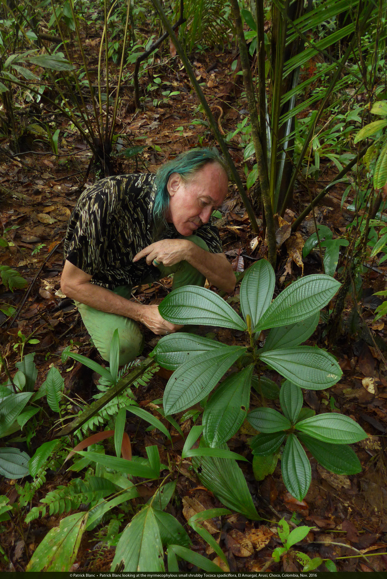 Patrick Blanc observing the corrugated petiolar ant pouches of the myrmecophilous Tococa spadiciflora, El Amargal, Arusi, Choco, Colombia, Nov. 2016