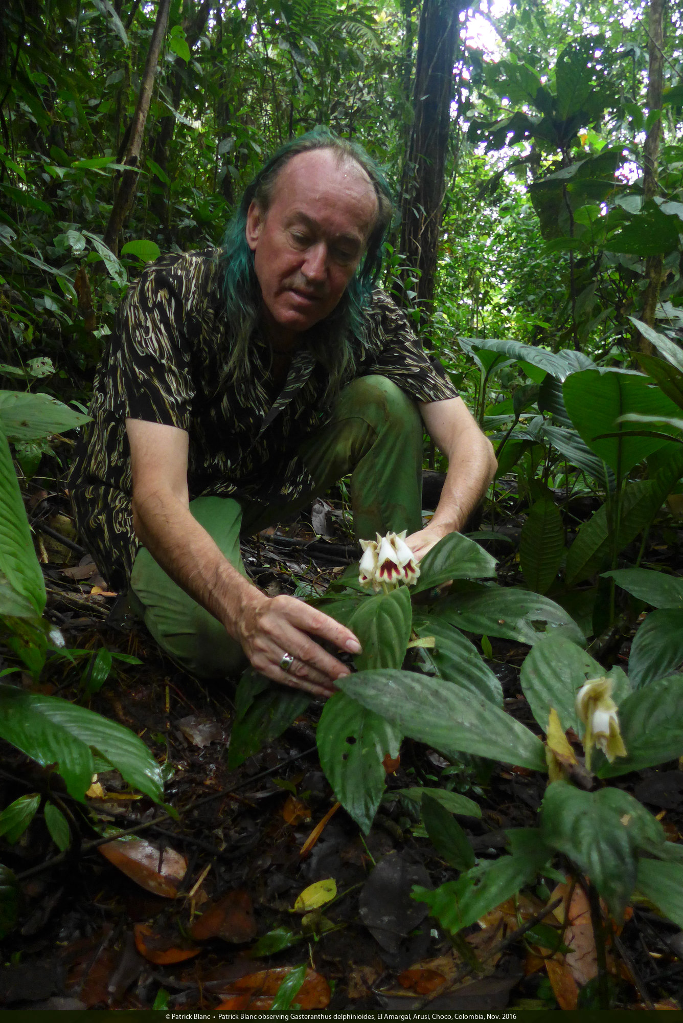 Patrick Blanc observing Gasteranthus delphinioides, El Amargal, Arusi, Choco, Colombia, Nov. 2016
