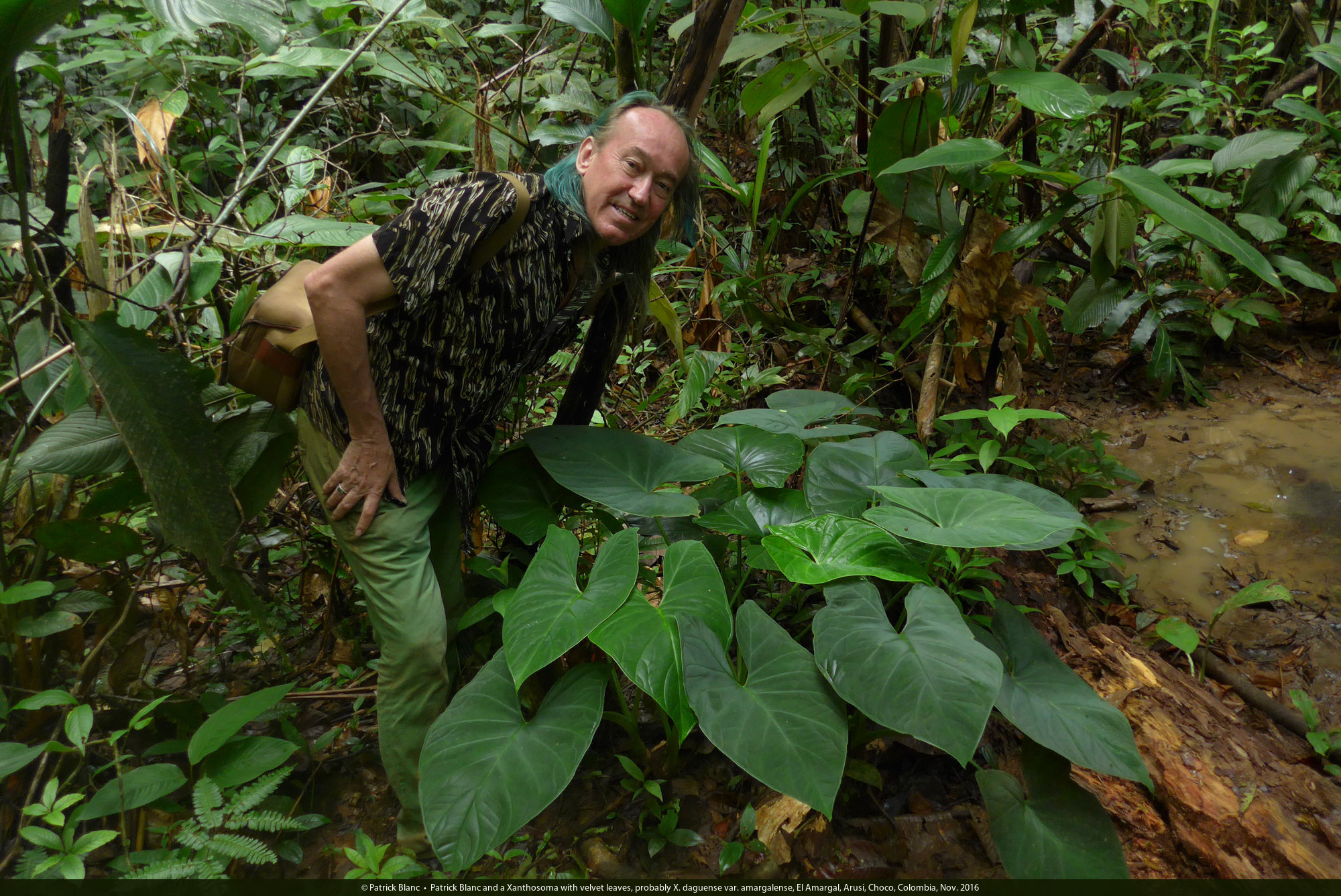 Patrick Blanc and a Xanthosoma with velvet leaves, probably X. daguense var. amargalense, El Amargal, Arusi, Choco, Colombia, Nov. 2016