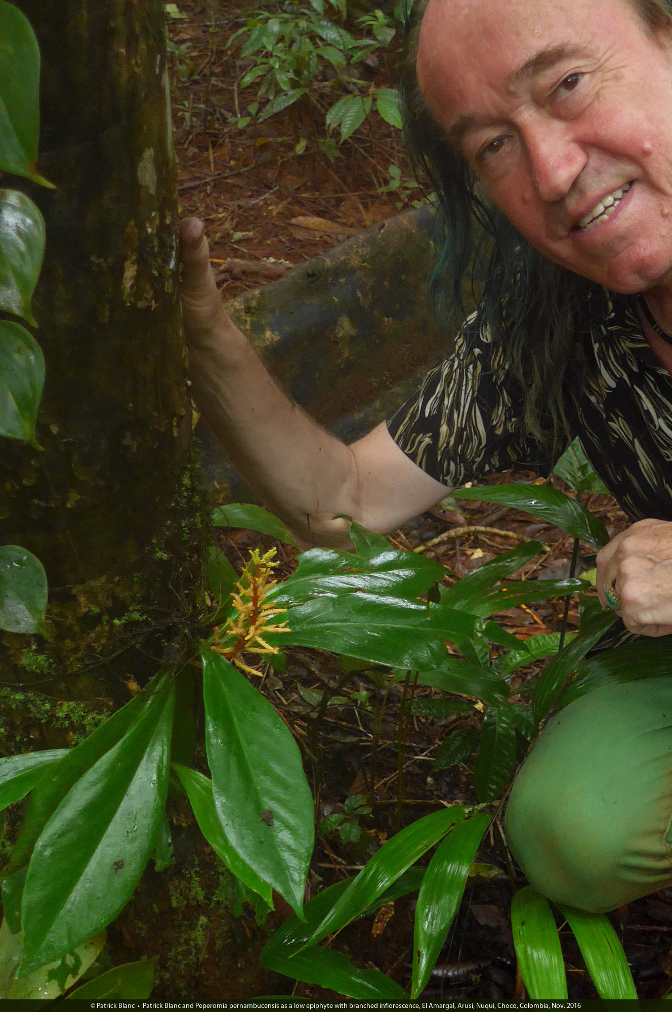 Patrick Blanc and Peperomia pernambucensis as a low epiphyte with branched inflorescence, El Amargal, Arusi, Nuqui, Choco, Colombia, Nov. 2016