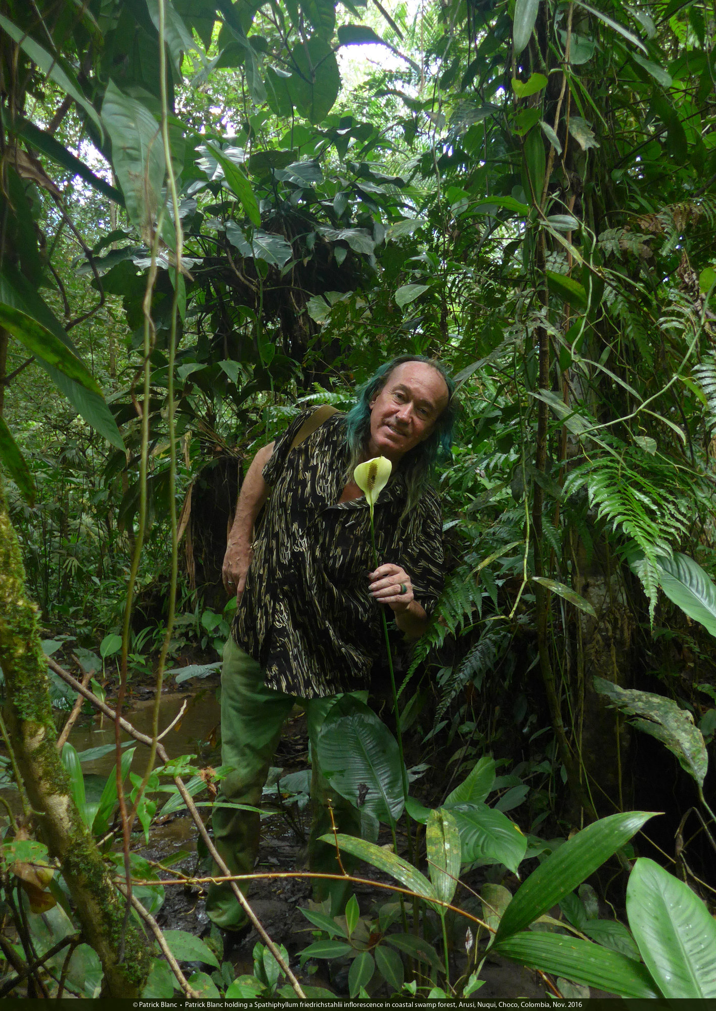 Patrick Blanc holding a Spathiphyllum friedrichstahlii inflorescence in coastal swamp forest, Arusi, Nuqui, Choco, Colombia, Nov. 2016