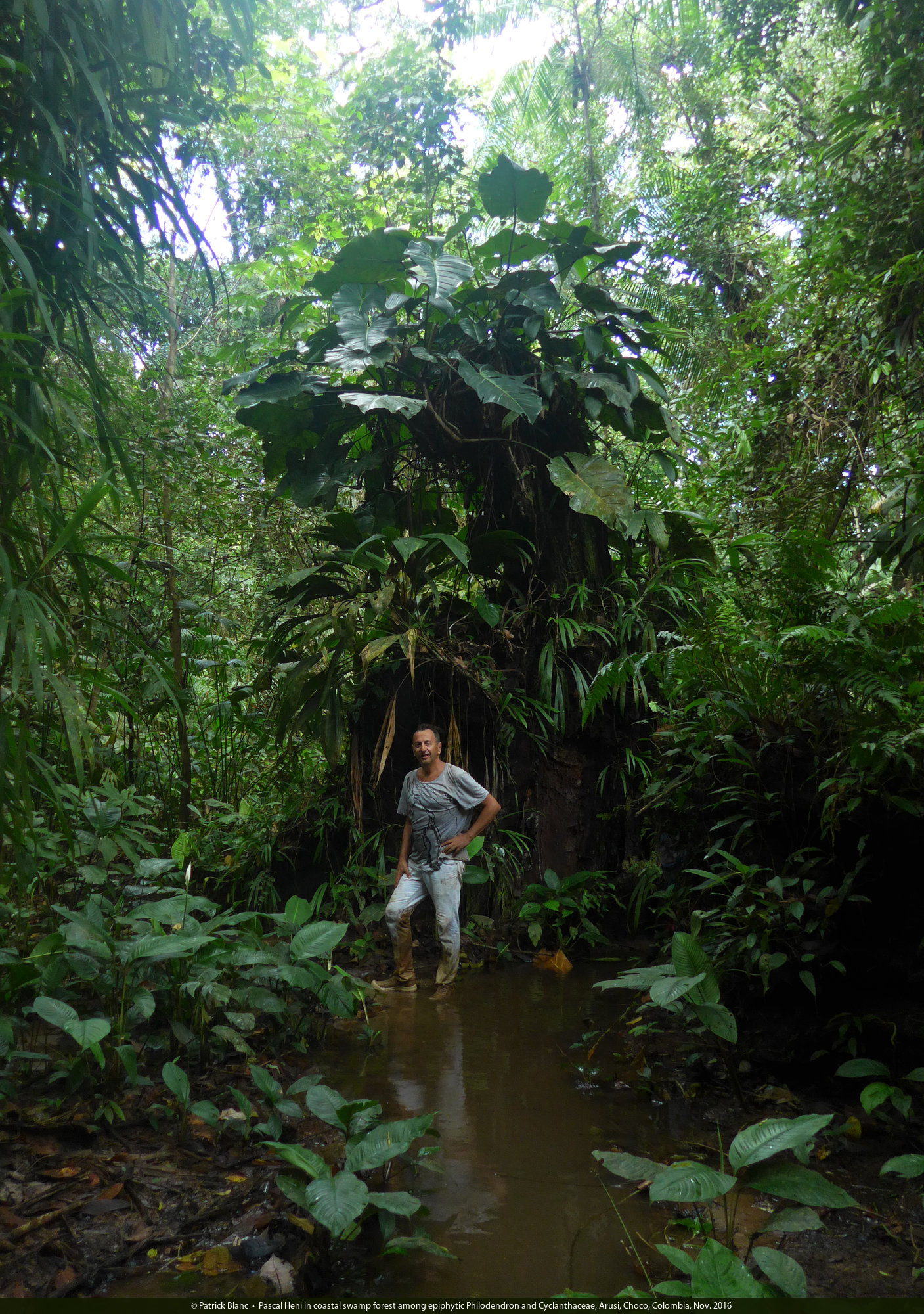 Pascal Heni in coastal swamp forest among epiphytic Philodendron and Cyclanthaceae, Arusi, Choco, Colombia, Nov. 2016