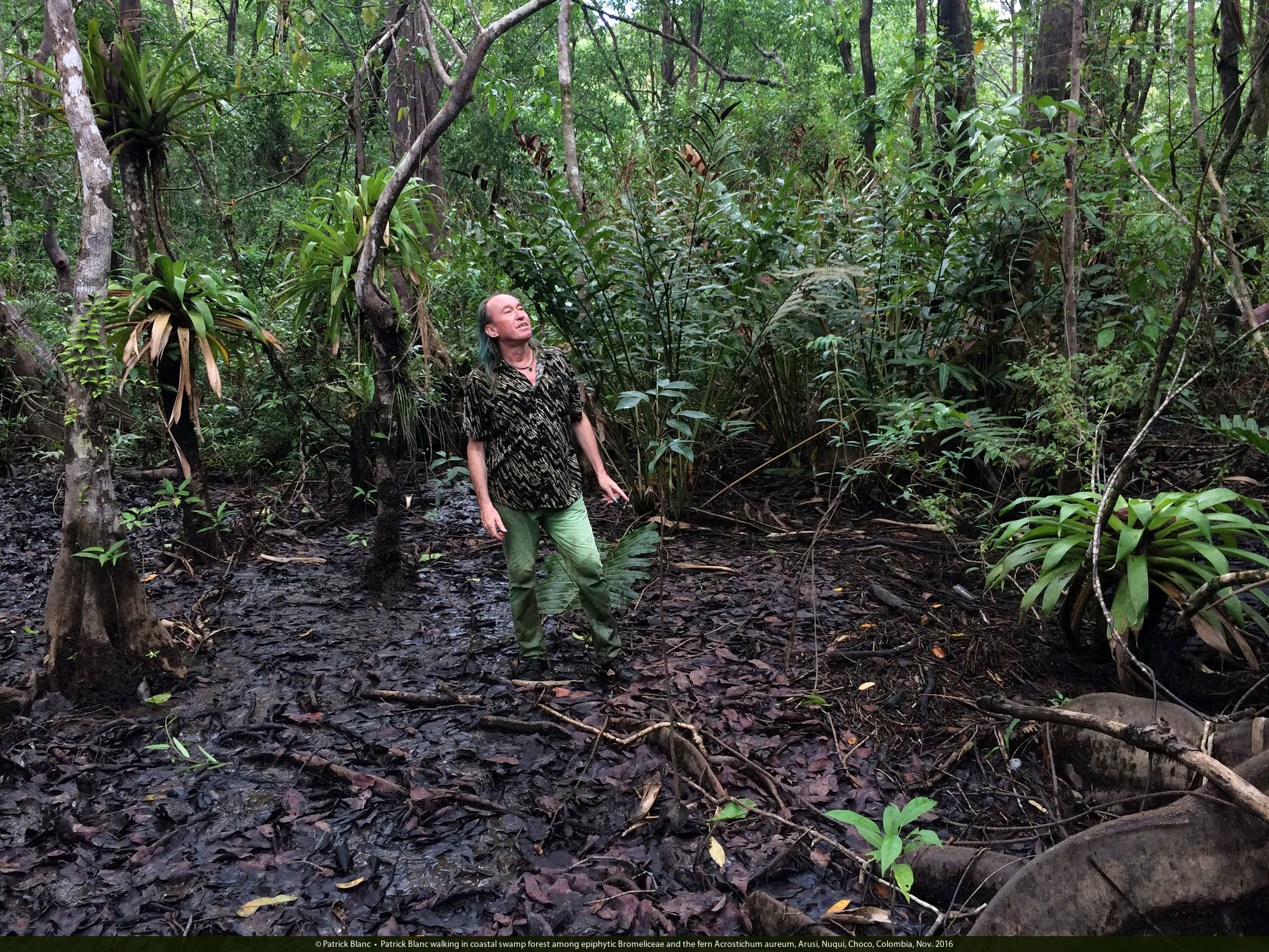 Patrick Blanc walking in coastal swamp forest among epiphytic Bromeliceae and the fern Acrostichum aureum, Arusi, Nuqui, Choco, Colombia, Nov. 2016