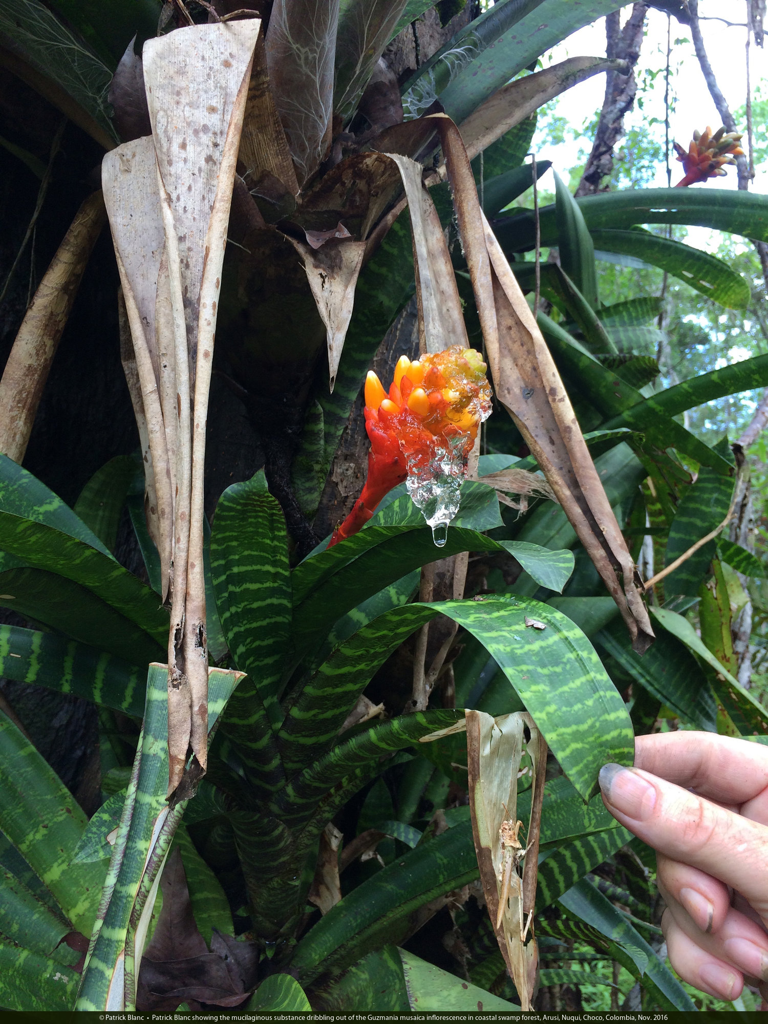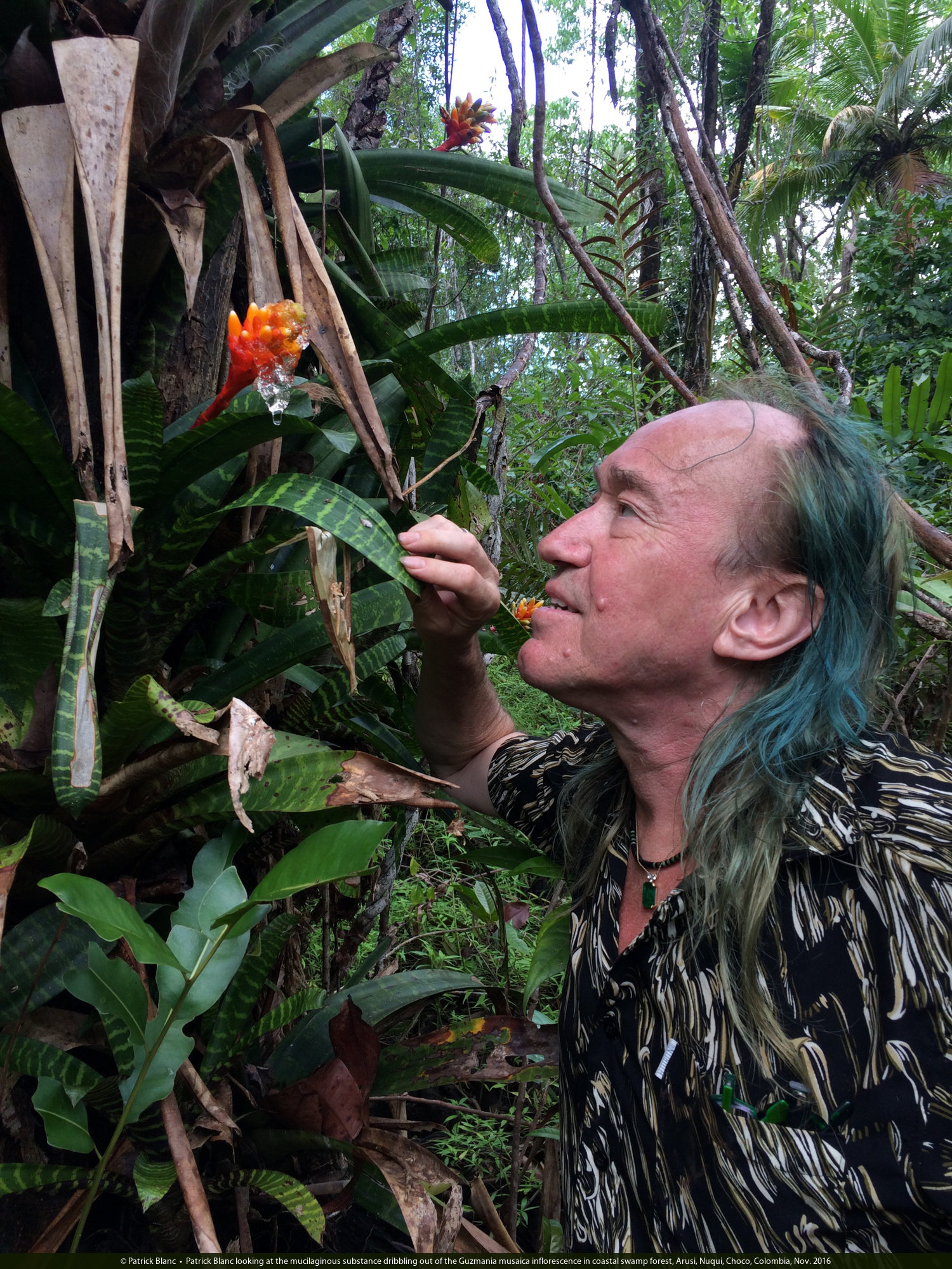 Patrick Blanc showing the mucilaginous substance dribbling out of the Guzmania musaica inflorescence in coastal swamp forest, Arusi, Nuqui, Choco, Colombia, Nov. 2016