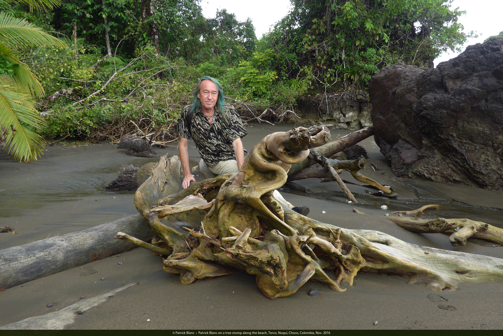 Patrick Blanc on a tree stump along the beach, Terco, Nuqui, Choco, Colombia, Nov. 2016