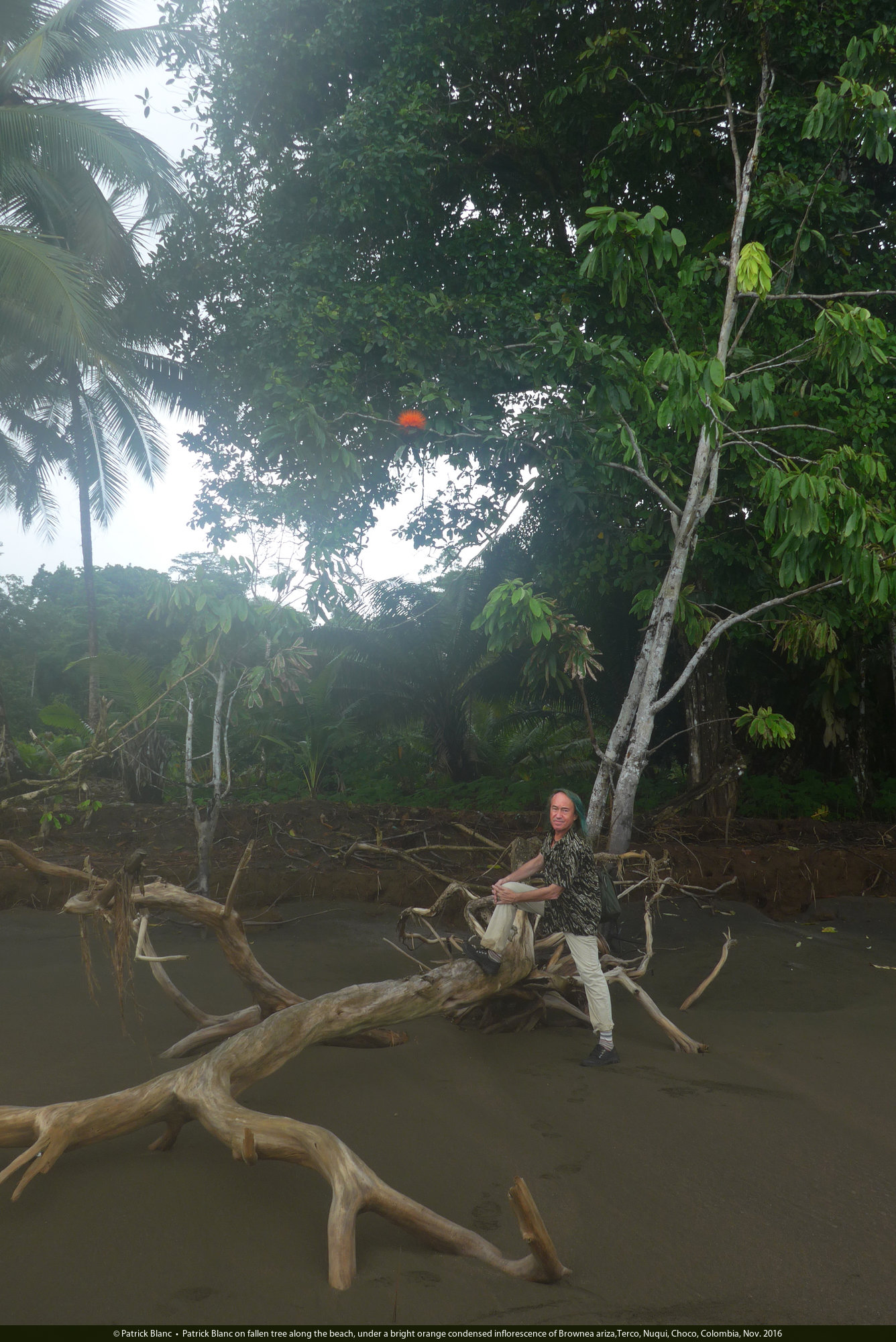 Patrick Blanc on fallen tree along the beach, under a bright orange condensed inflorescence of Brownea ariza,Terco, Nuqui, Choco, Colombia, Nov. 2016