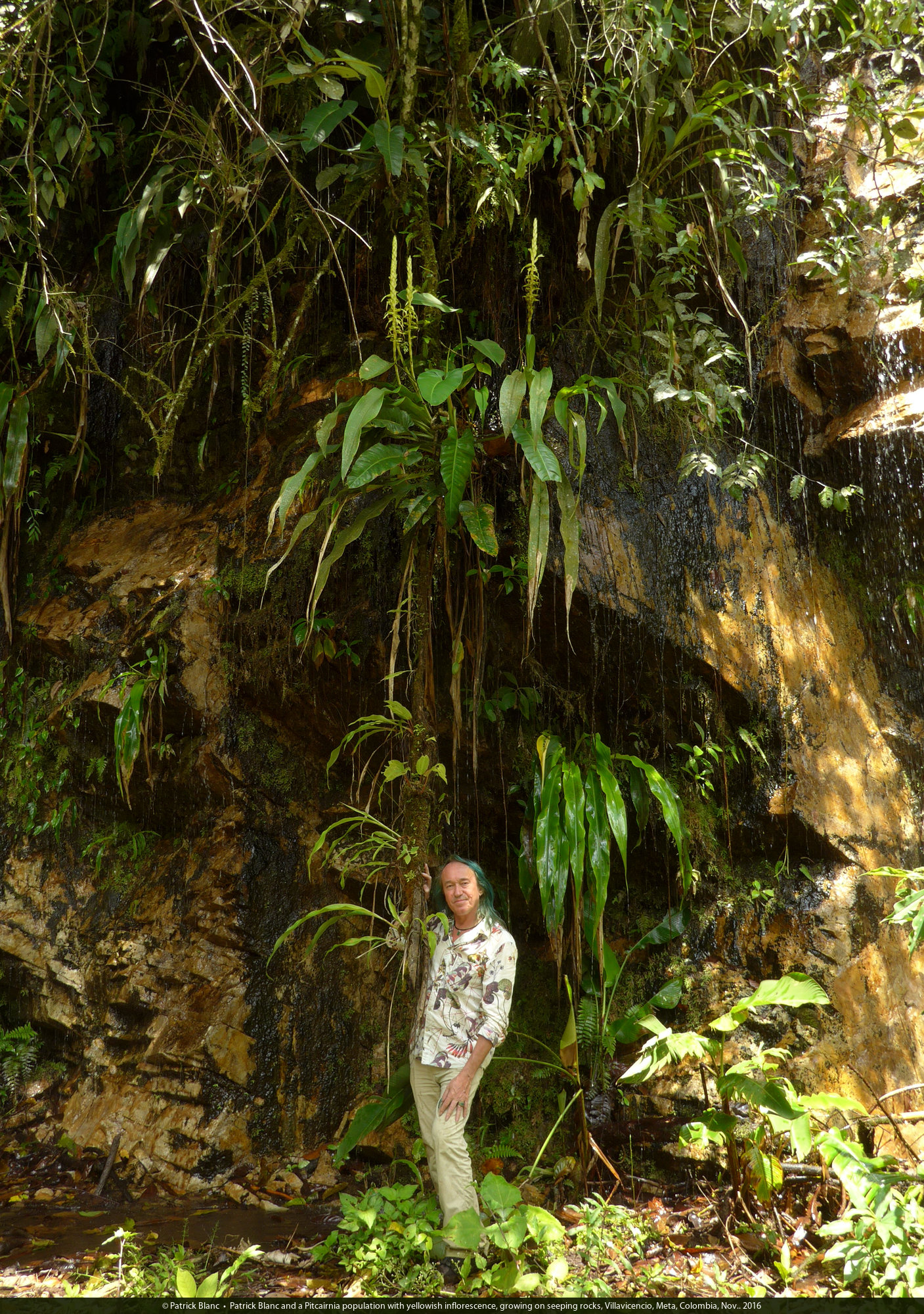 Patrick Blanc and a Pitcairnia population with yellowish inflorescence, growing on seeping rocks, Villavicencio, Meta, Colombia, Nov.. 2016