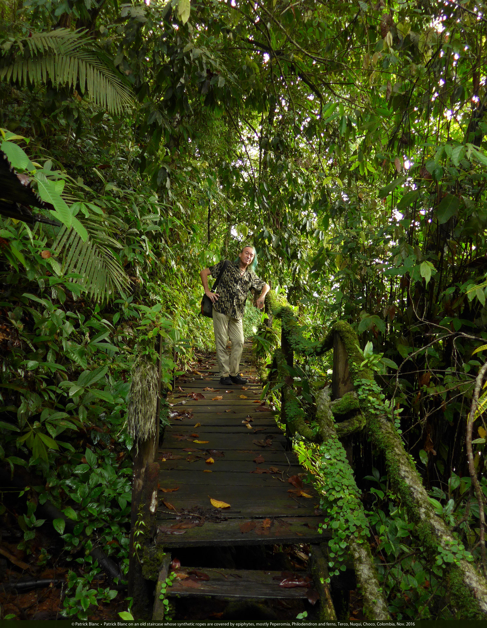 Patrick Blanc on an old staircase whose synthetic ropes are covered by epiphytes, mostly Peperomia, Philodendron and ferns, Terco, Nuqui, Choco, Colombia, Nov. 2016