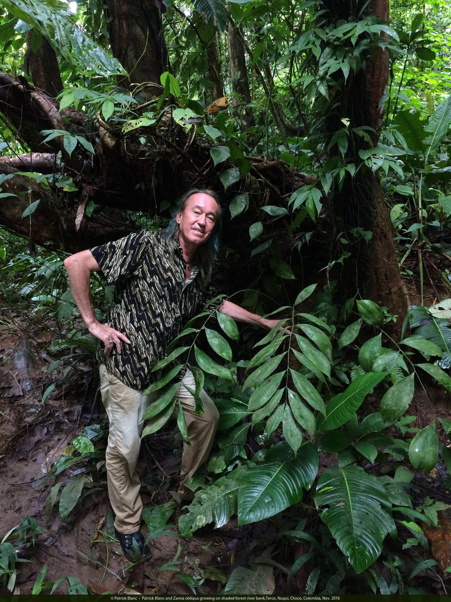 Patrick Blanc and Zamia obliqua growing on shaded forest river bank,Terco, Nuqui, Choco, Colombia, Nov. 2016