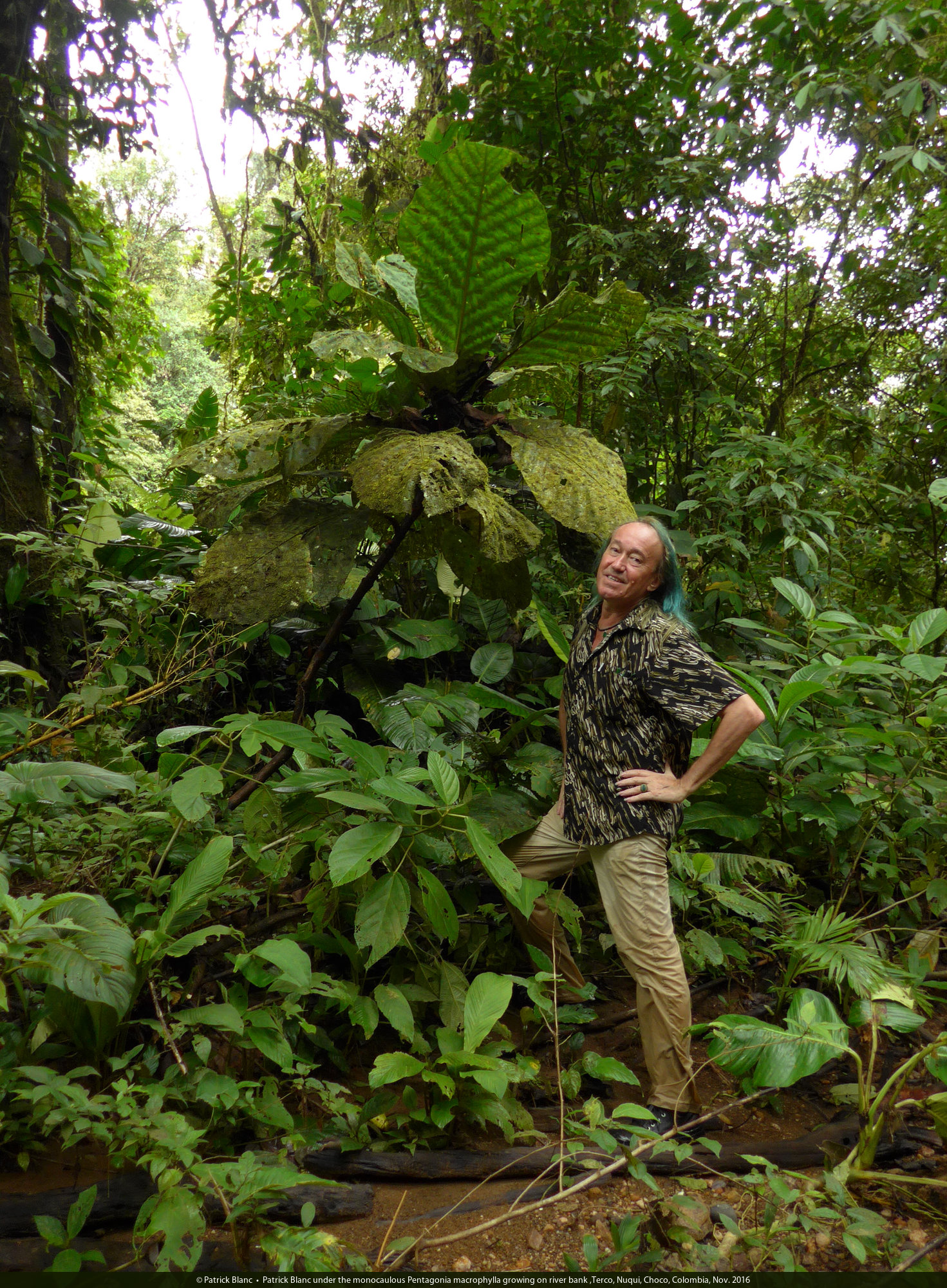 Patrick Blanc under the monocaulous Pentagonia macrophylla growing on river bank ,Terco, Nuqui, Choco, Colombia, Nov. 2016