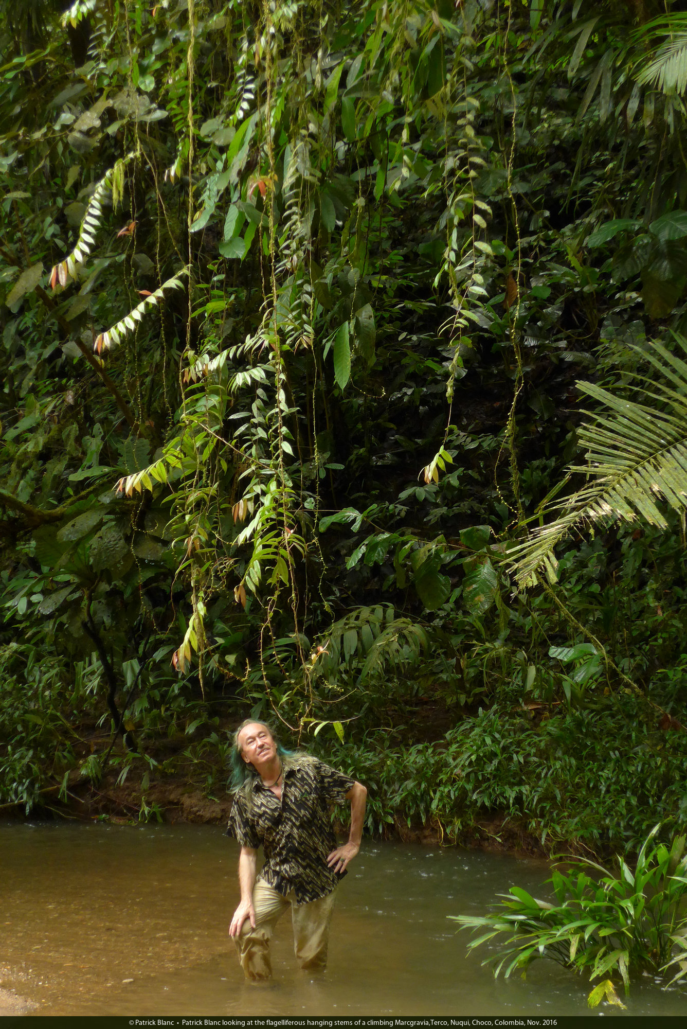 Patrick Blanc under the flagelliferous hanging stems of a climbing Marcgravia,Terco, Nuqui, Choco, Colombia, Nov. 2016