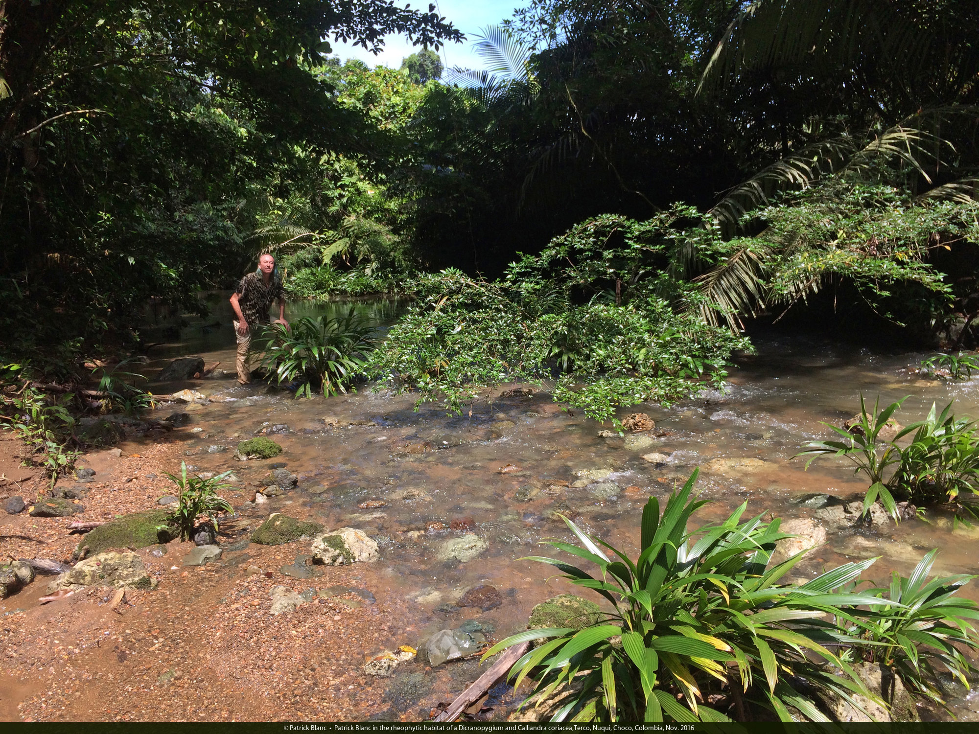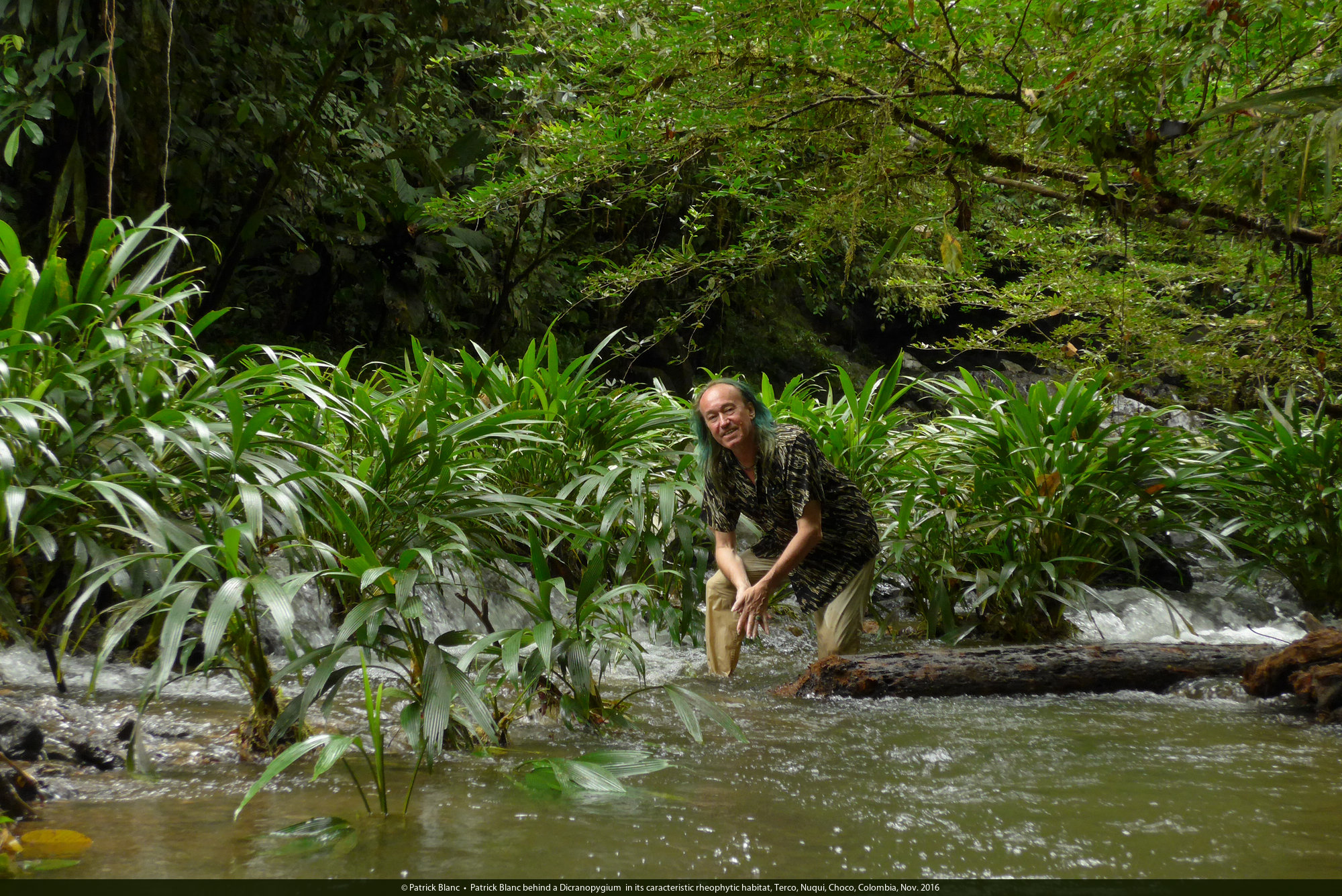 Patrick Blanc walking in the rheophytic habitat of Dicranopygium cf. testaceum,Terco, Nuqui, Choco, Colombia, Nov. 2016