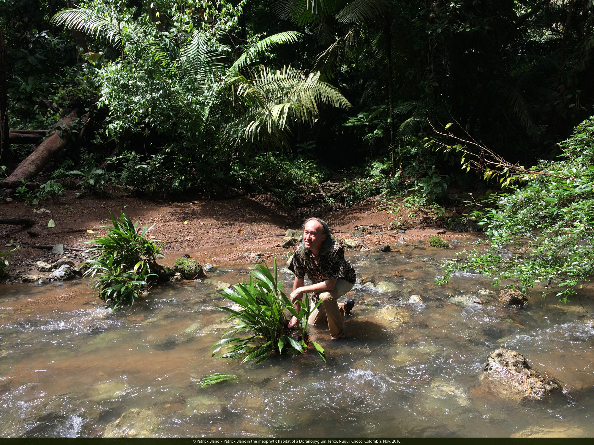 Patrick Blanc sitting on the banks of a fast flowing river among a population of a tiny new Dicranopygium species with entire leaves,Terco, Nuqui, Choco, Colombia, Nov. 2016