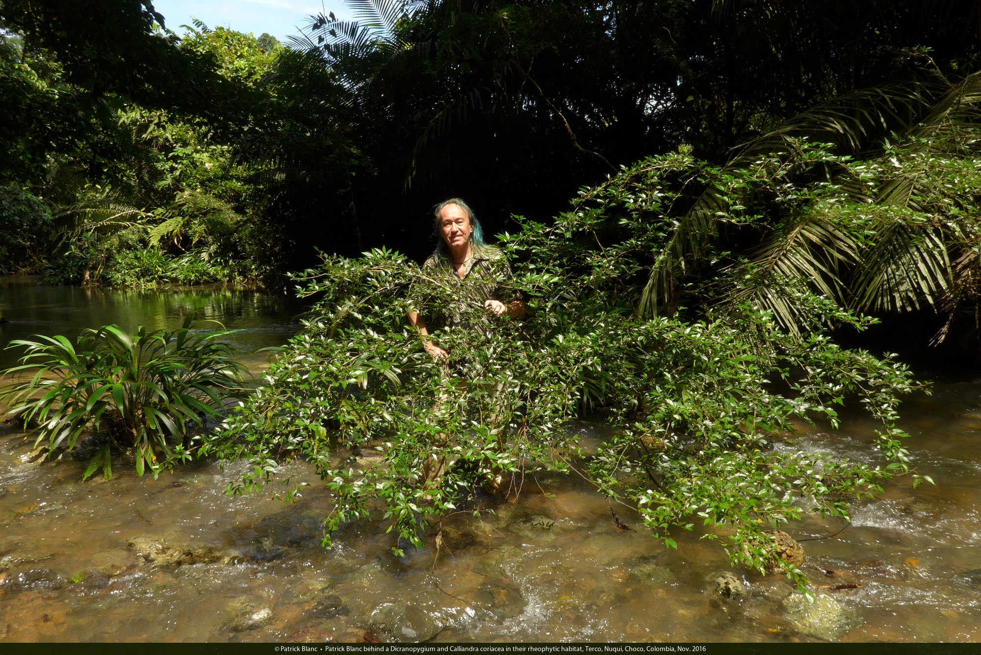 Patrick Blanc in Pentagonia macrophylla habitat, along a shaded river bank , Terco, Nuqui, Choco, Colombia, Nov. 2016