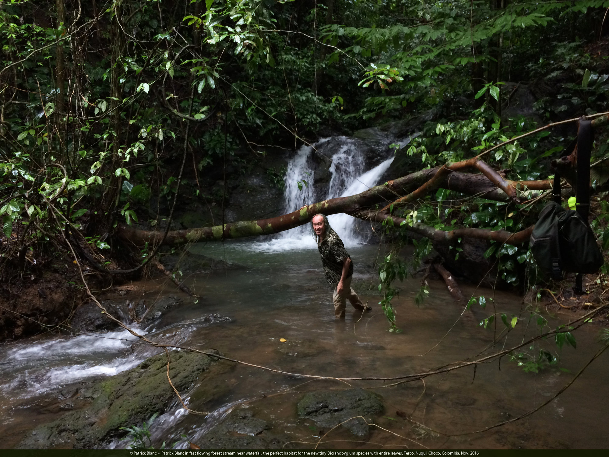 Patrick Blanc in fast flowing forest stream near waterfall, the perfect habitat for the new tiny Dicranopygium species with entire leaves, Terco, Nuqui, Choco, Colombia, Nov. 2016