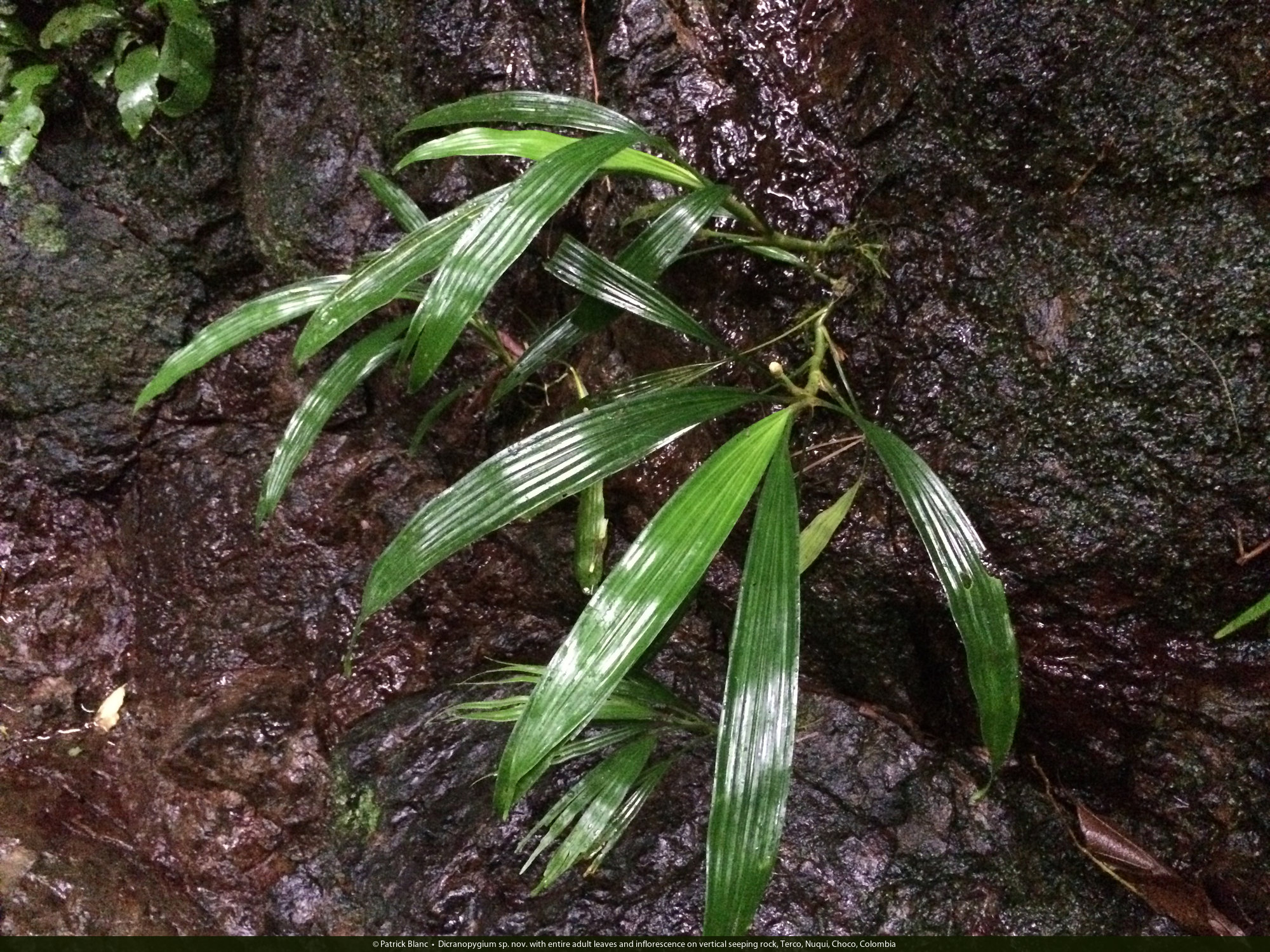 Dicranopygium sp. nov. with entire adult leaves and inflorescence on vertical seeping rock, Terco, Nuqui, Choco, Colombia