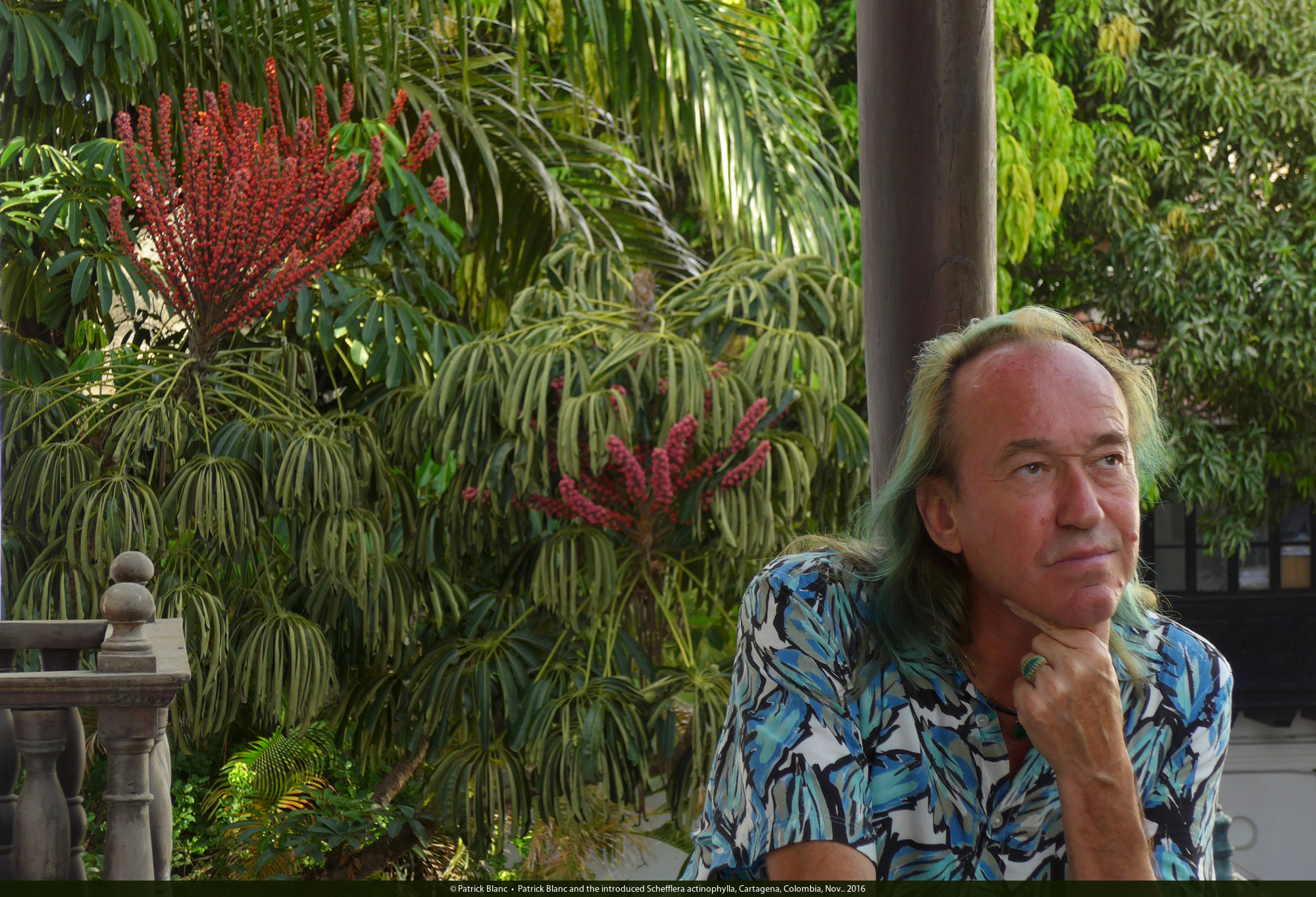 Patrick Blanc and the introduced Schefflera actinophylla, Cartagena, Colombia, Nov.. 2016