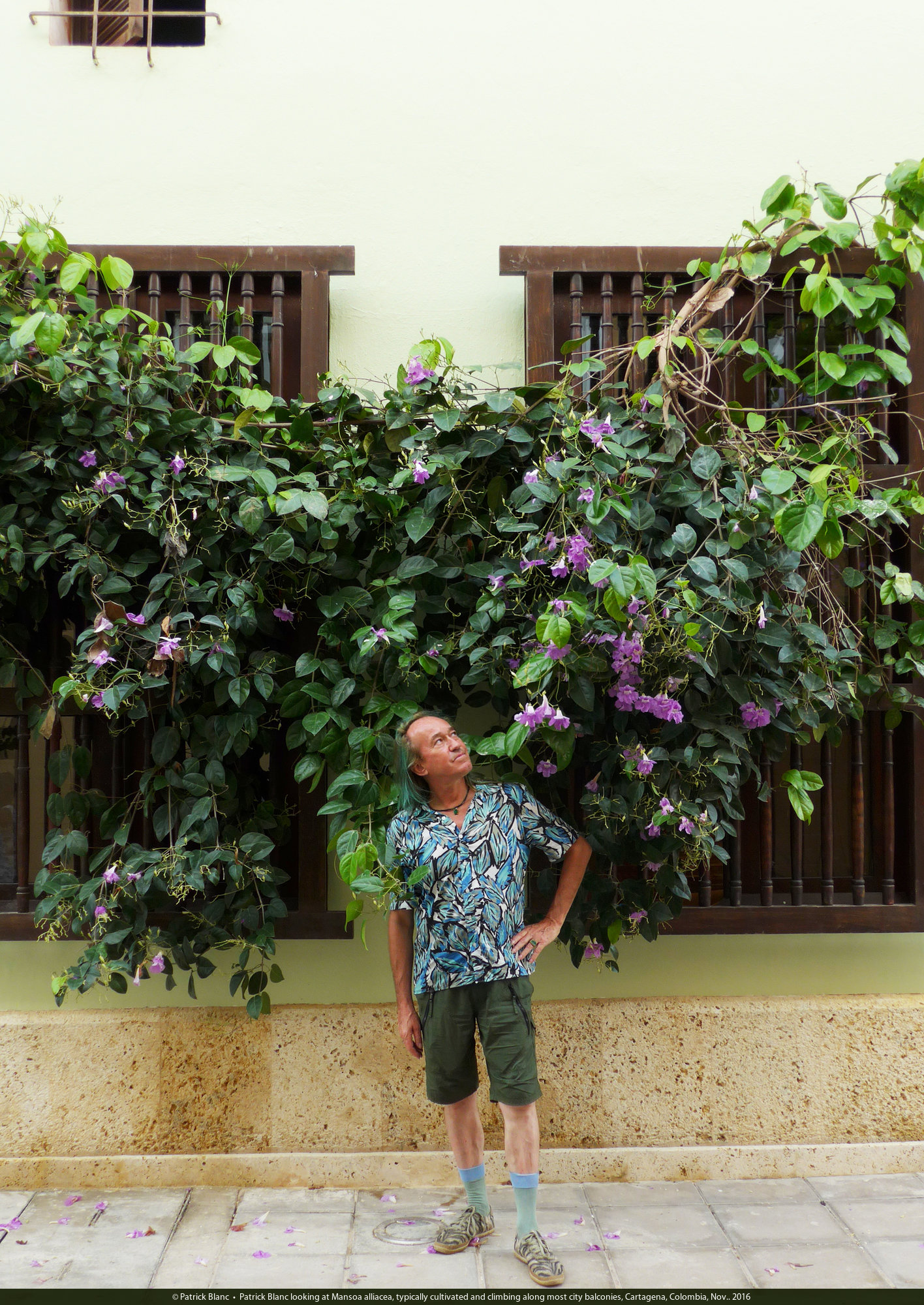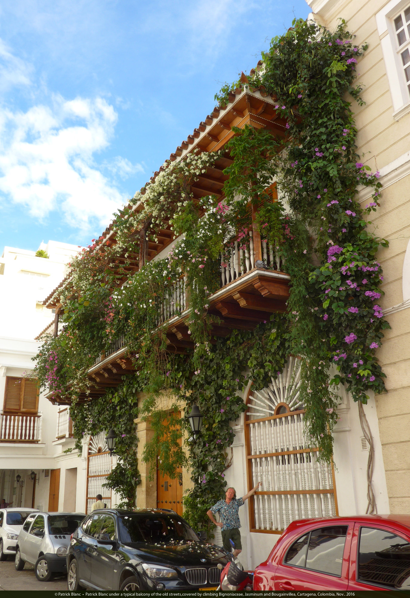 Patrick Blanc under a typical balcony of the old streets,covered by climbing Bignoniaceae, Jasminum and Bougainvillea, Cartagena, Colombia, Nov.. 2016