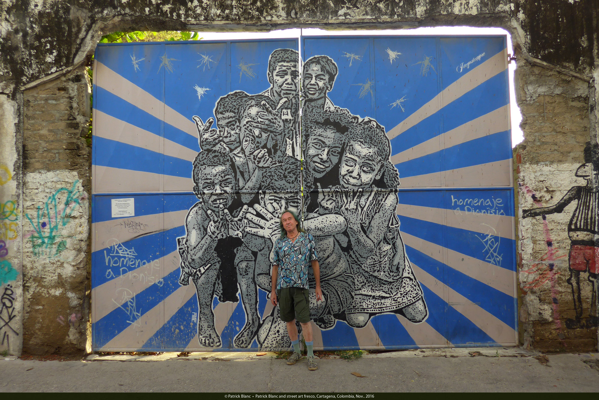 Patrick Blanc and street art fresco, Cartagena, Colombia, Nov.. 2016