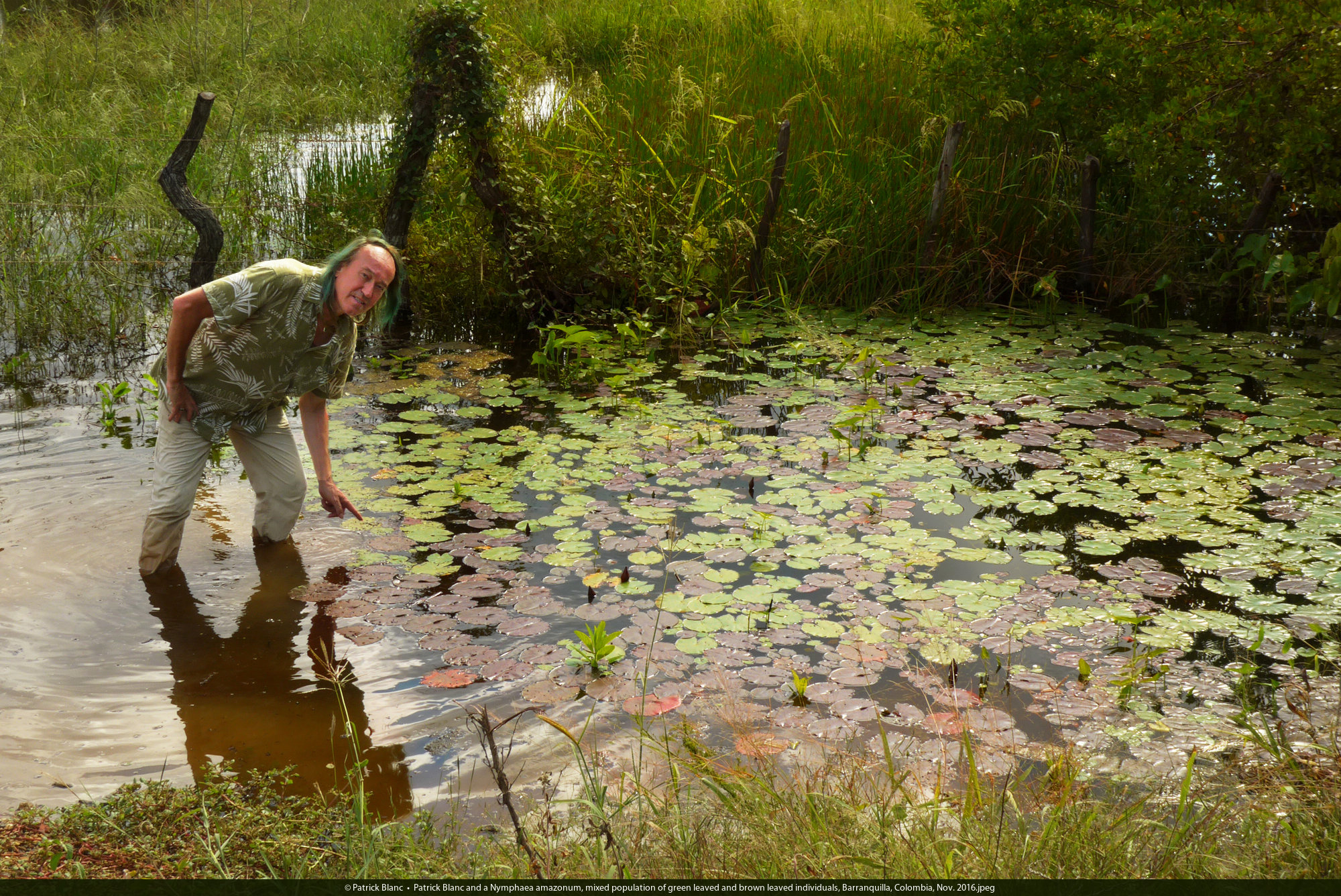 Patrick Blanc and Nymphaea amazonum, mixed population of green leaved and brown leaved individuals, Barranquilla, Colombia, Nov. 2016.jpeg