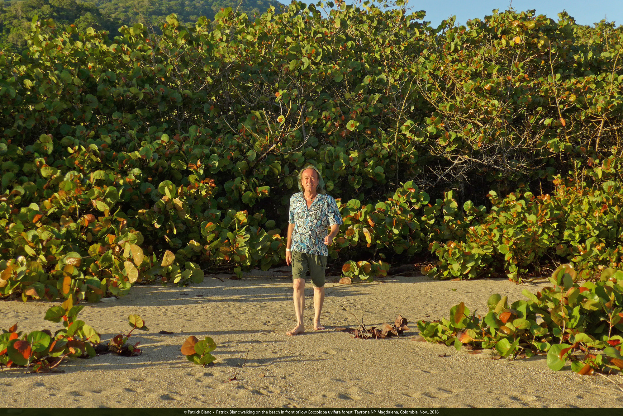 Patrick Blanc walking on the beach in front of low Coccoloba uvifera forest, Tayrona NP, Magdalena, Colombia, Nov.. 2016