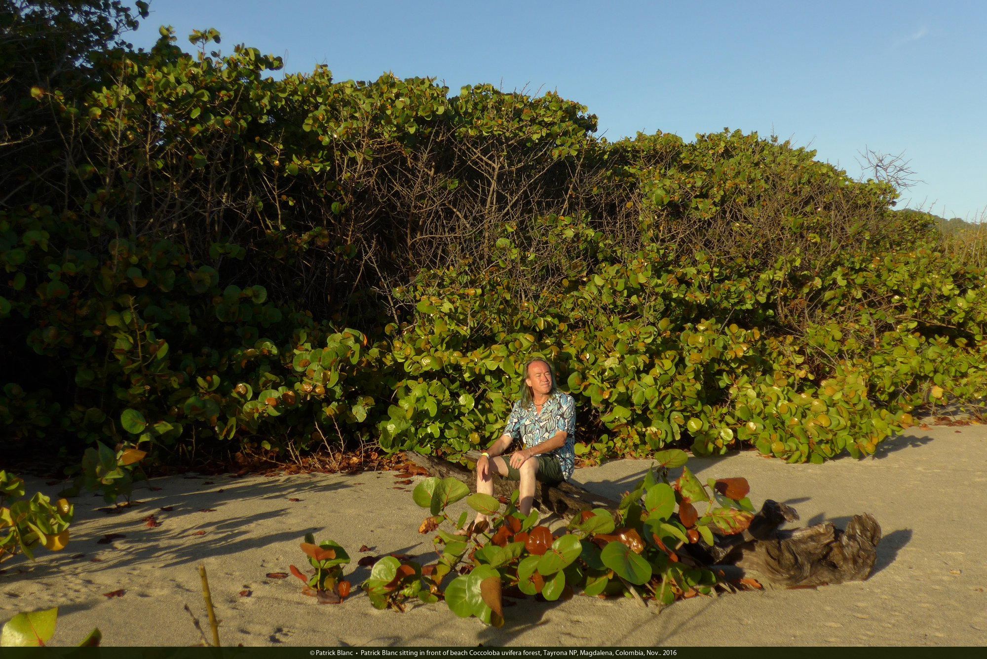 Patrick Blanc sitting in front of beach Coccoloba uvifera forest, Tayrona NP, Magdalena, Colombia, Nov.. 2016