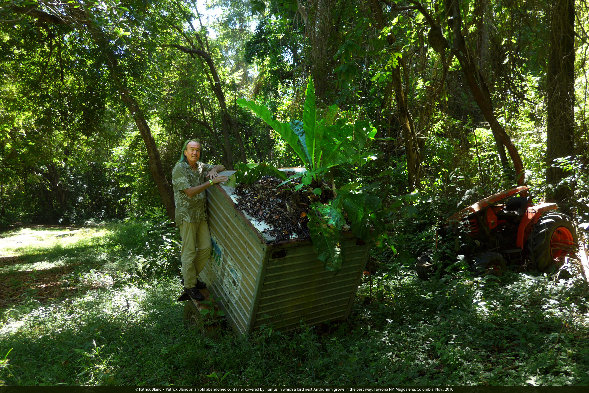Patrick Blanc on an old abandoned container covered by humus in which a bird nest Anthurium grows in the best way, Tayrona NP, Magdalena, Colombia, Nov.. 2016
