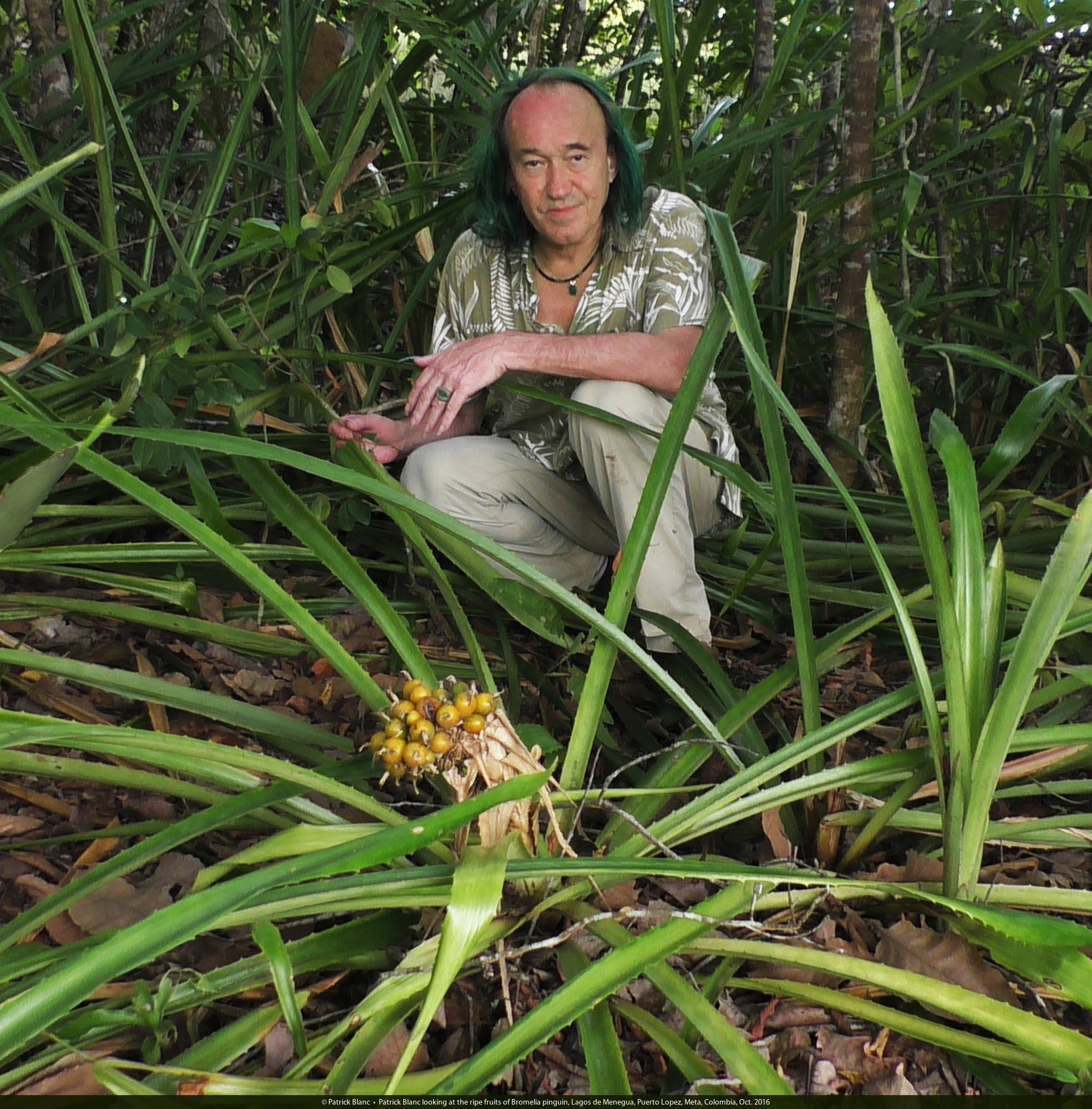Patrick Blanc looking at the ripe fruits of Bromelia pinguin, Lagos de Menegua, Puerto Lopez, Meta, Colombia, Oct. 2016