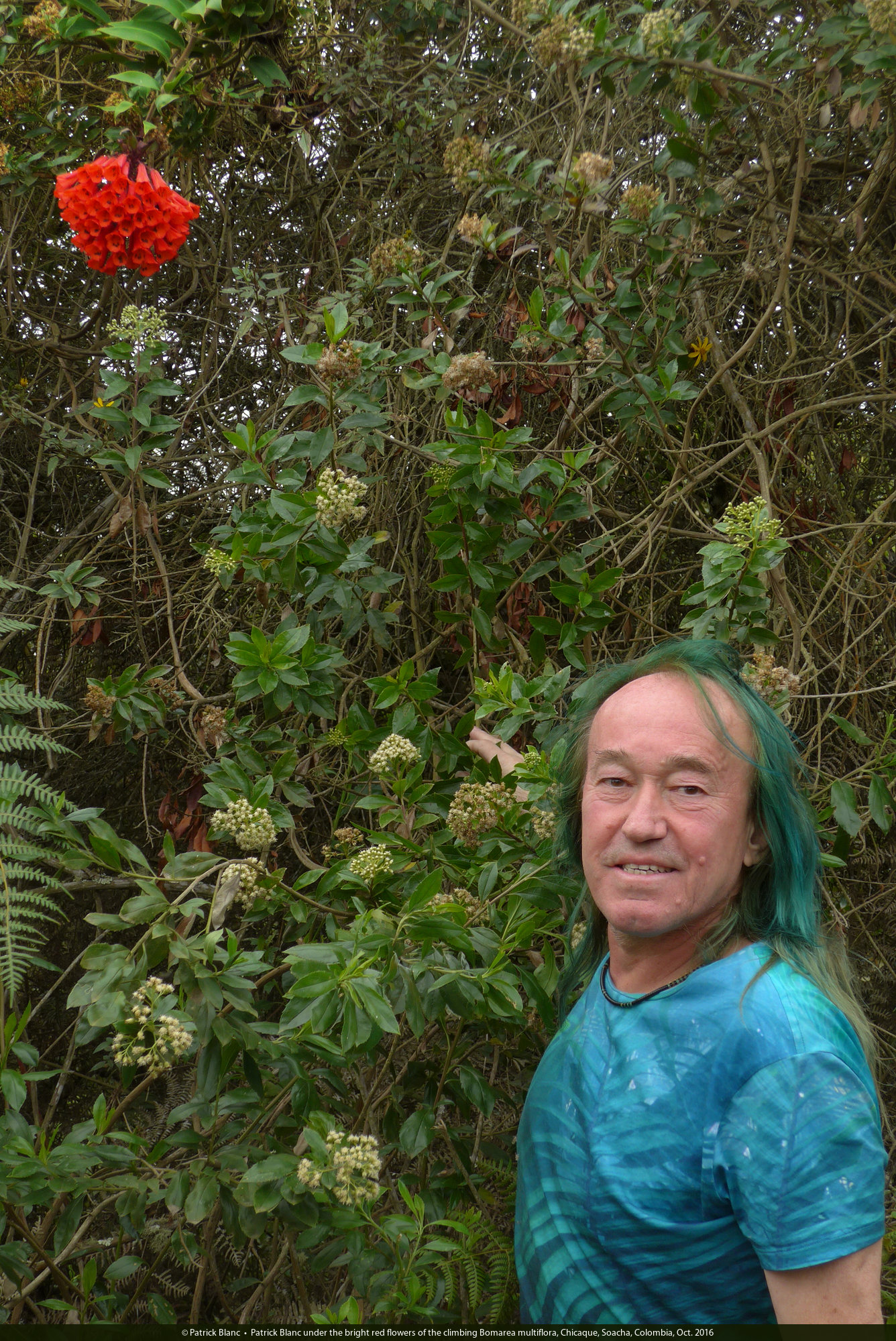 Patrick Blanc under the bright red flowers of the climbing Bomarea multiflora, Chicaque, Soacha, Colombia, Oct. 2016