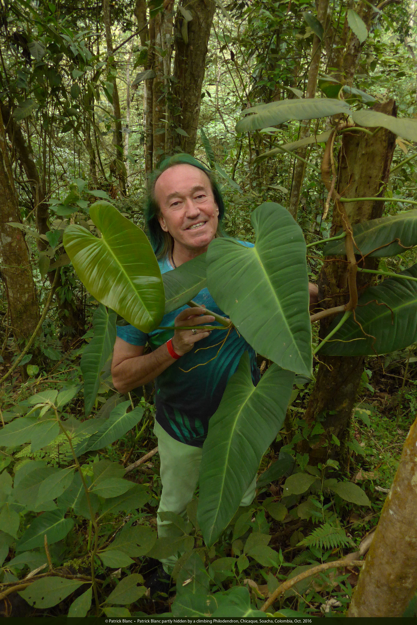 Patrick Blanc partly hidden by a climbing Philodendron, Chicaque, Soacha, Colombia, Oct. 2016