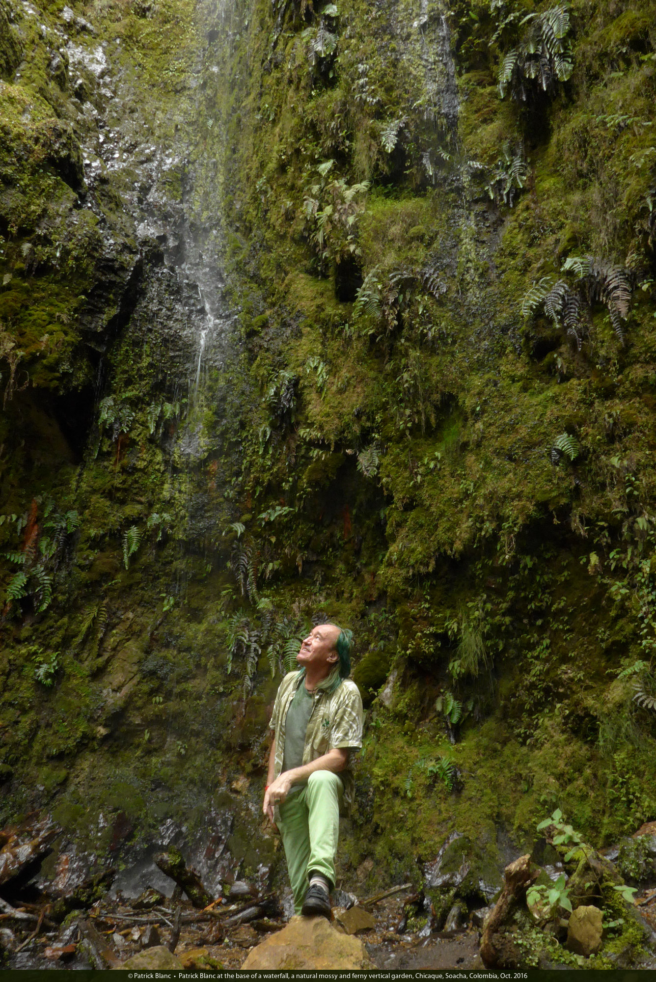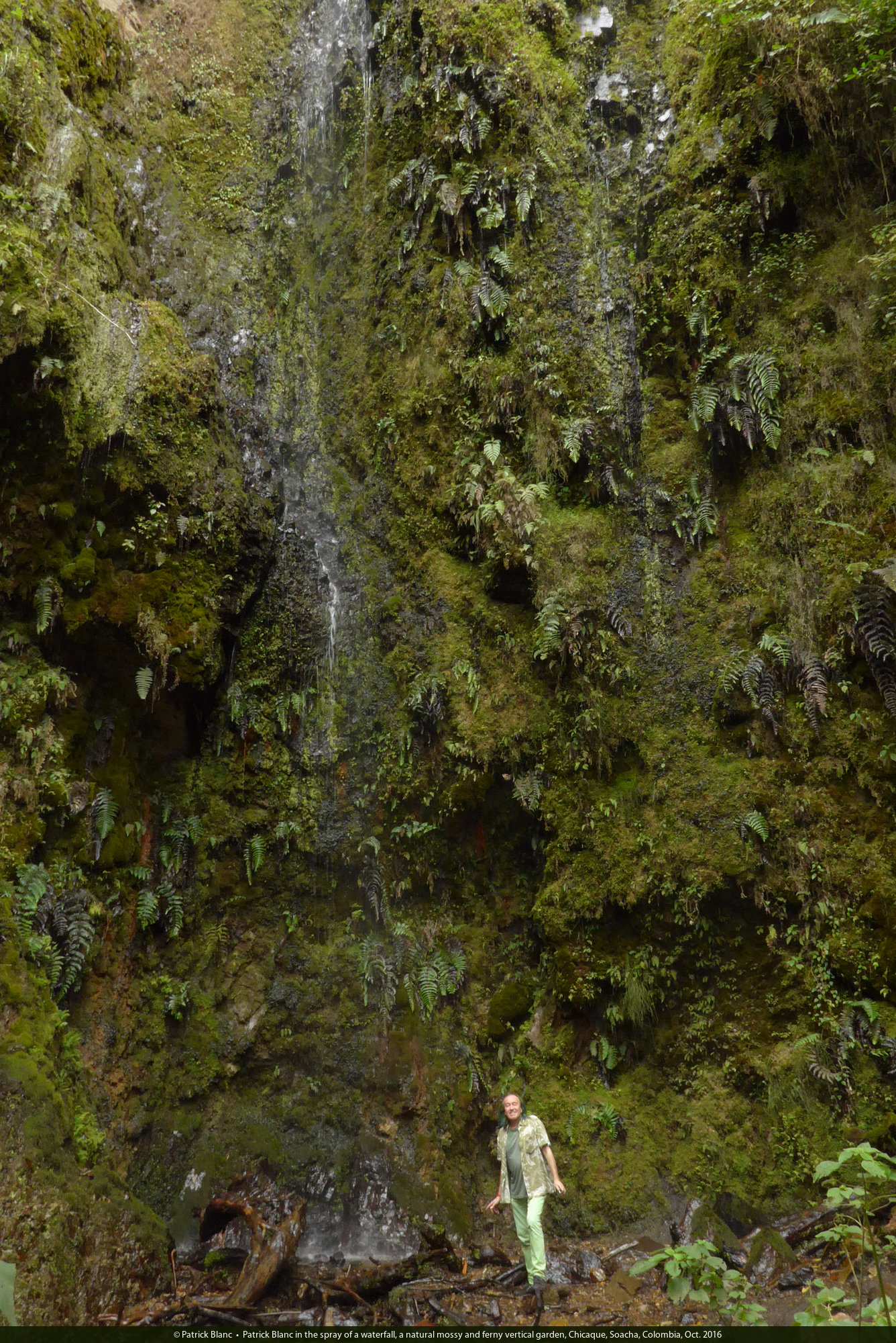 Patrick Blanc at the base of a waterfall, a natural mossy and ferny vertical garden, Chicaque, Soacha, Colombia, Oct. 2016