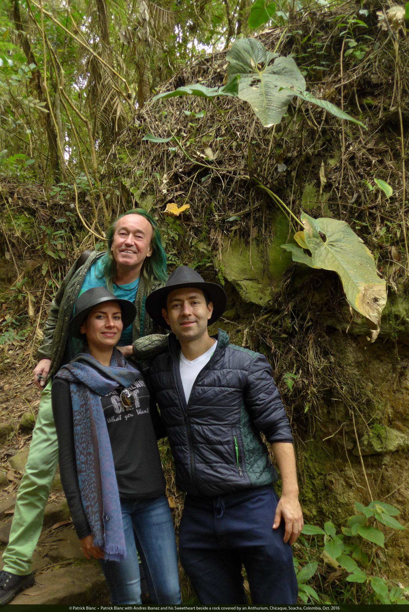 Patrick Blanc with Andres Ibanez and his Sweetheart beside a rock covered by an Anthurium, Chicaque, Soacha, Colombia, Oct. 2016