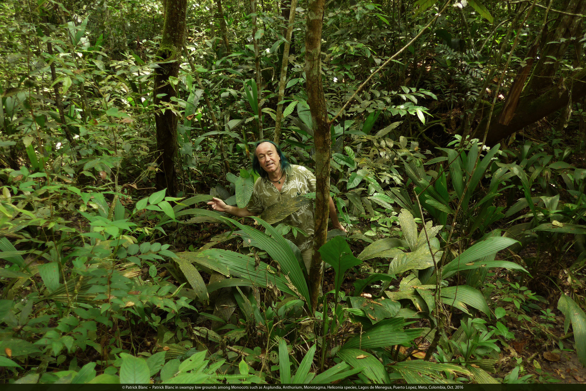 Patrick Blanc in swampy low grounds among Monocots such as Asplundia, Anthurium, Monotagma, Heliconia species, Lagos de Menegua, Puerto Lopez, Meta, Colombia, Oct. 2016