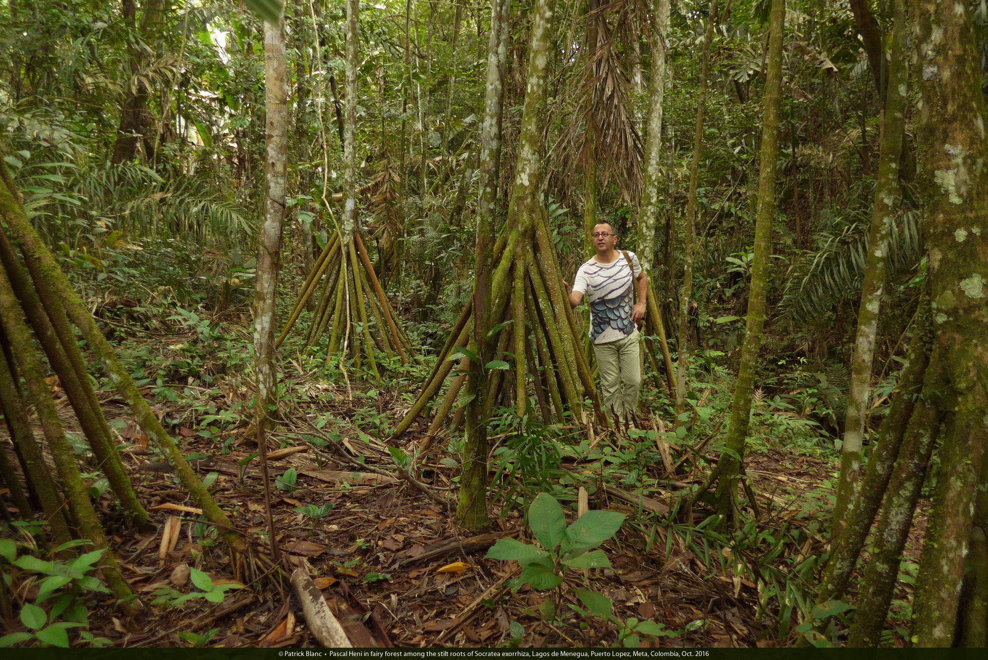 Pascal Heni in fairy forest among the stilt roots of Socratea exorrhiza, Lagos de Menegua, Puerto Lopez, Meta, Colombia, Oct. 2016