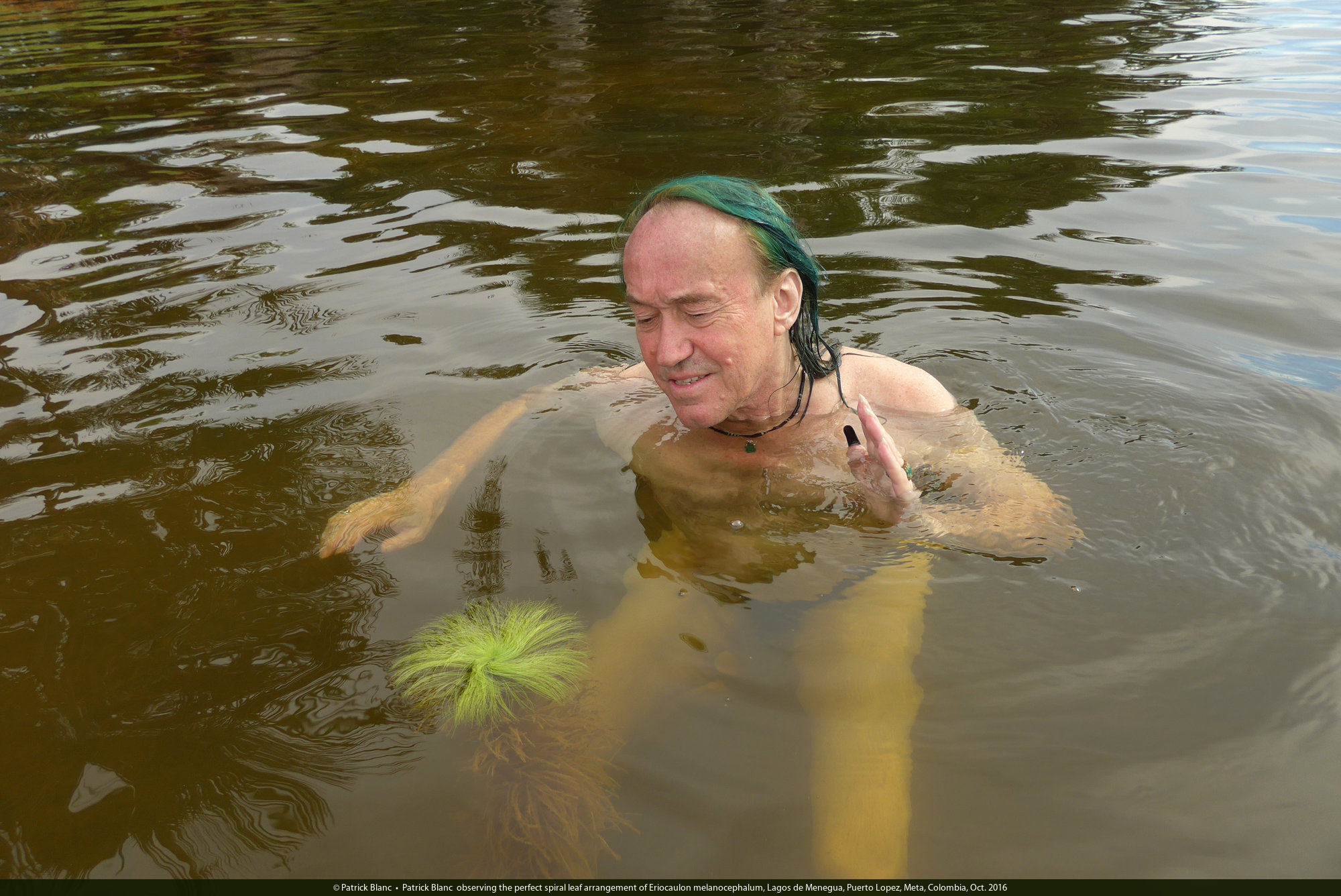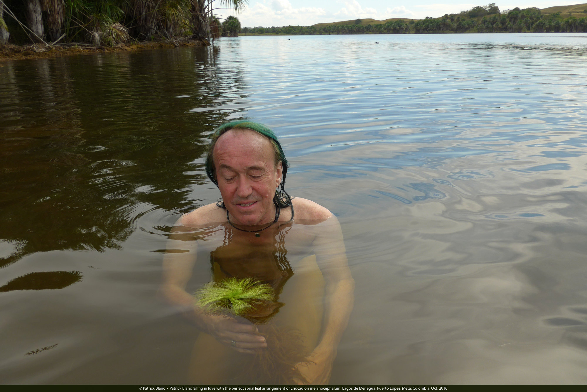 Patrick Blanc observing the perfect spiral leaf arrangement of Eriocaulon melanocephalum, Lagos de Menegua, Puerto Lopez, Meta, Colombia, Oct. 2016