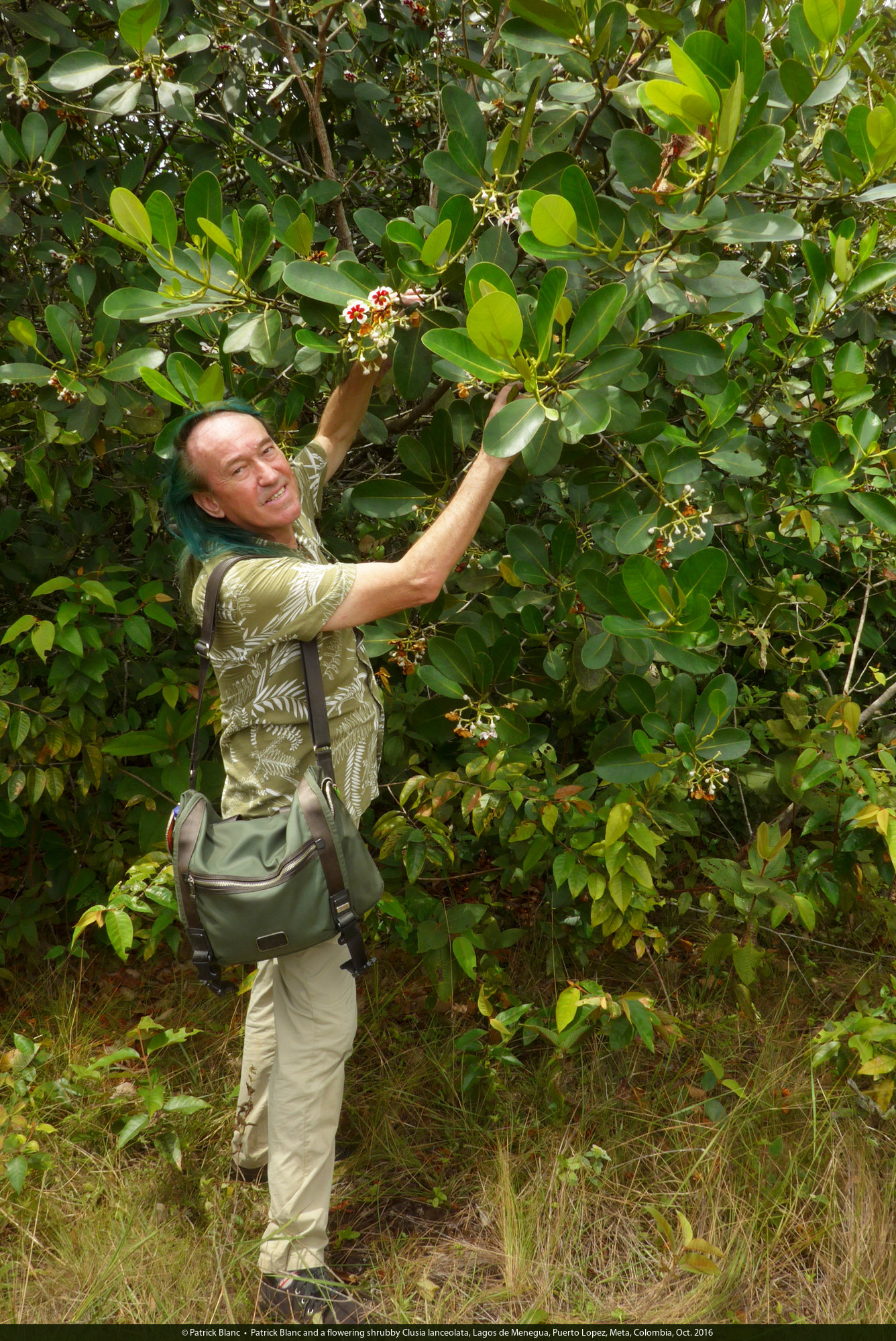 Patrick Blanc and a flowering shrubby Clusia lanceolata, Lagos de Menegua, Puerto Lopez, Meta, Colombia, Oct. 2016
