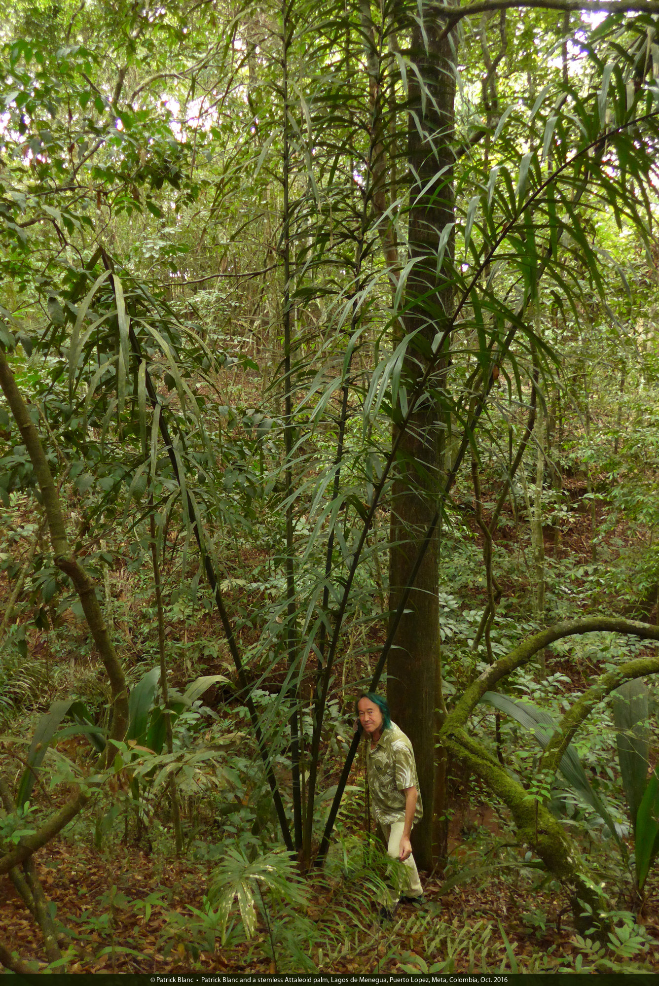 Patrick Blanc evaluating a young and promising stilt root of Socratea exorrhiza, Lagos de Menegua, Puerto Lopez, Meta, Colombia, Oct. 2016