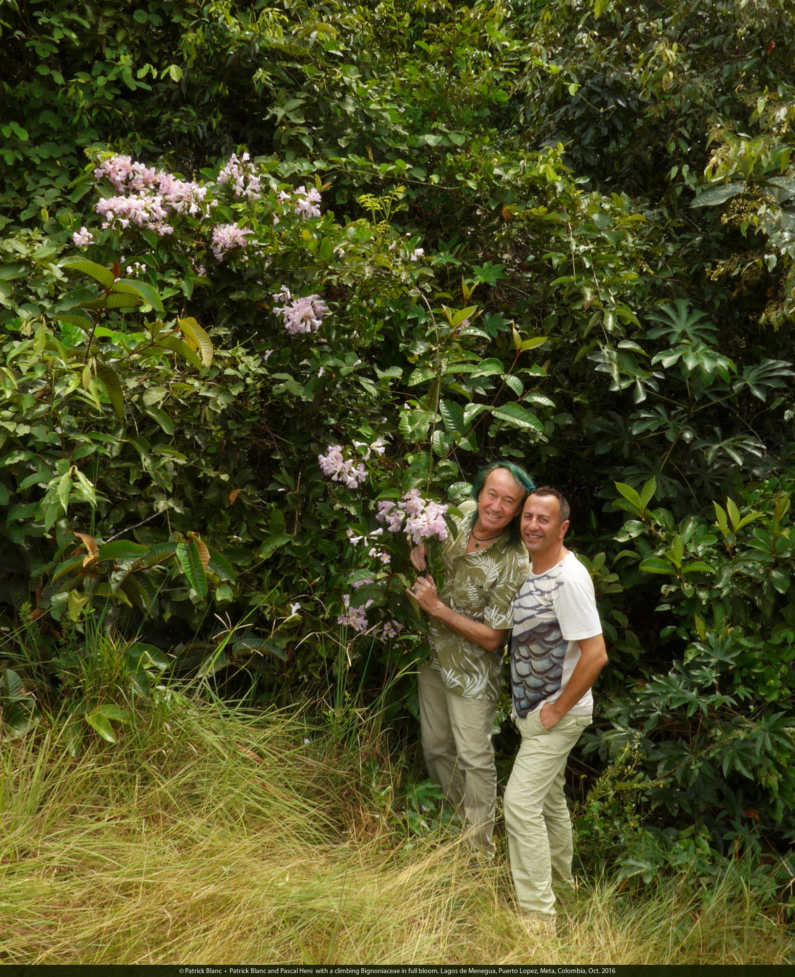 Patrick Blanc and Pascal Heni with a climbing Bignoniaceae in full bloom, Lagos de Menegua, Puerto Lopez, Meta, Colombia, Oct. 2016