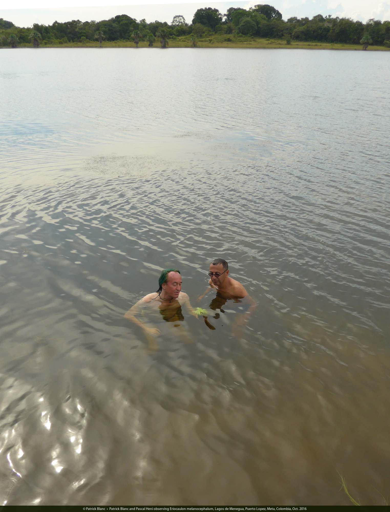 Patrick Blanc and Pascal Heni observing Eriocaulon melanocephalum, Lagos de Menegua, Puerto Lopez, Meta, Colombia, Oct. 2016